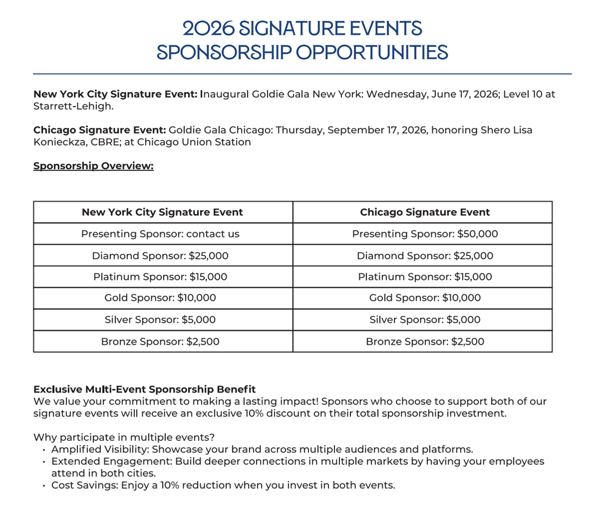 You're invited to join a special evening of fantastic high‑energy networking over sips, savories, and live entertainment—all in support of Women in the CRE Industry. Besides a short program, the Goldie Gala features a dynamic, table‑free format designed to keep you moving, mingling, and making meaningful connections. Think of it as a "networking event on steroids": vibrant, social, and intentionally crafted to spark new relationships across the industry.