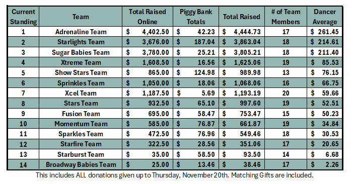 Team standings are based on the average amount raised per dancer due to different size teams. Full amounts from Piggy Banks will be added to each team's total at the end of the fundraising period.
