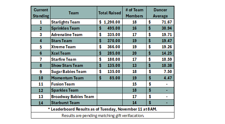 Team standings are based on the average amount raised per dancer due to different size teams. Full amounts from Piggy Banks will be added to each team's total at the end of the fundraising period.
