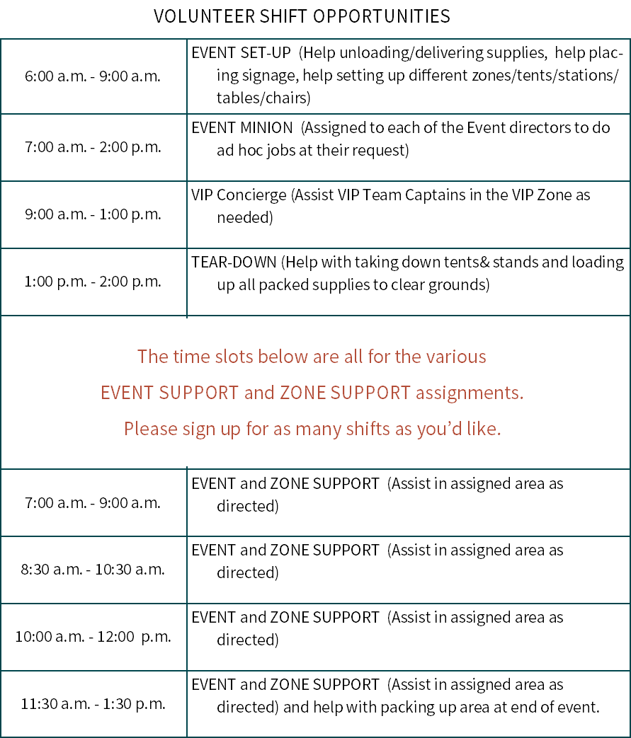 Multiple shifts for volunteers are available ranging in length from one-hour all the way up to seven-hours. Sign-up for as many shift times as you'd like to work.