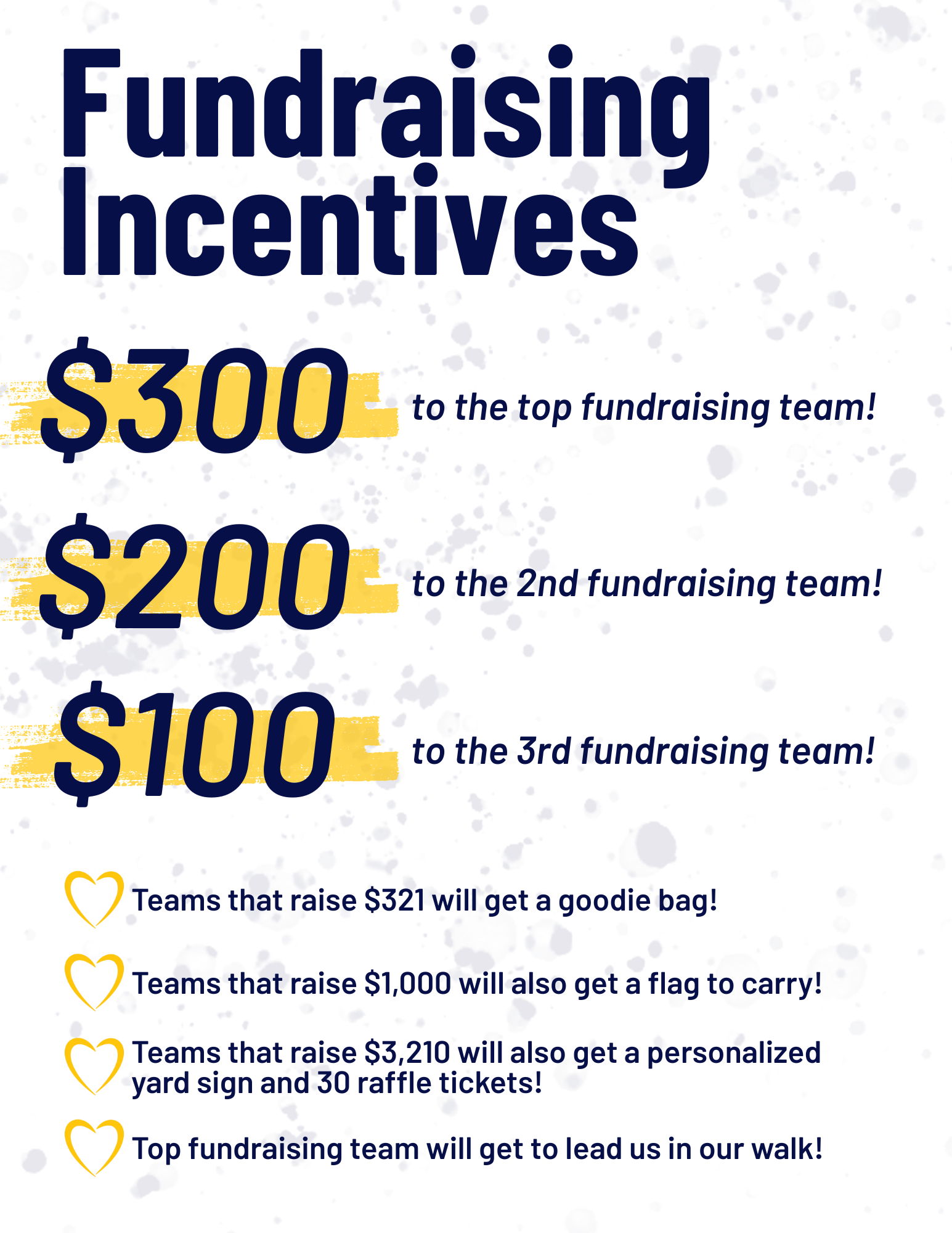 Pick-Up Info: T-shirts are available to be picked up at the Walk on September 28th. T-shirt tables will be located near registration. Please designate ONE PERSON ONLY from your group or team to check in at registration, turn in all money, and pick up t-shirts.