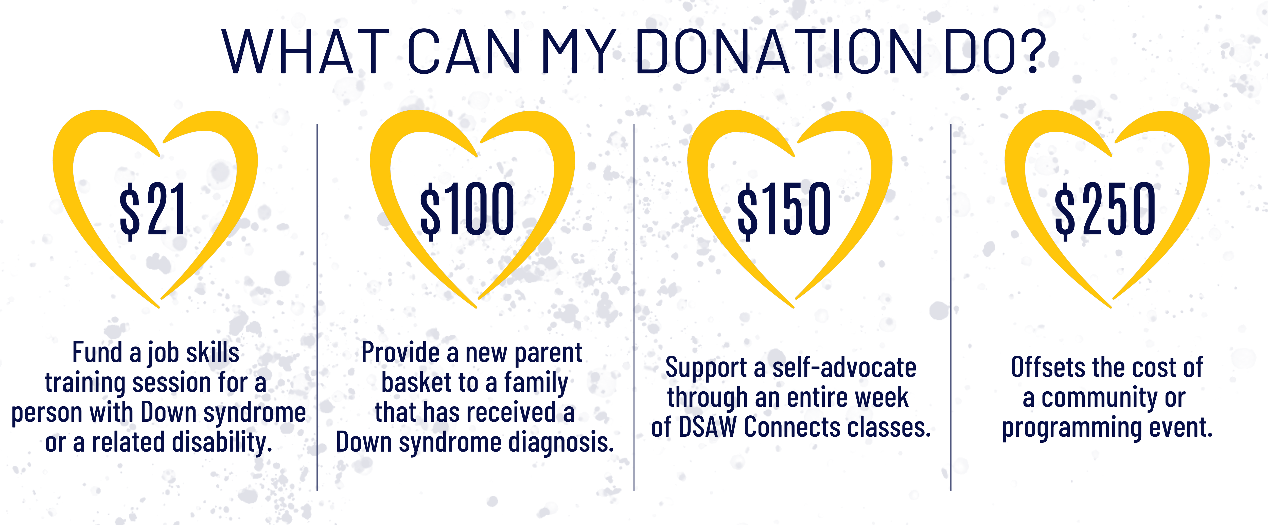 With the support of our generous friends like you, we were able to host events for caregivers and individuals with Down syndrome, send new and expectant parent packs at no cost to parents who received a Down syndrome diagnosis, and so much MORE in 2024! WOW - thank you! We rely on the incredible support of our community to make DSAW-Chippewa Valley's services happen. The majority of our programs and events are fully funded by this annual Awareness Walk, and we need YOU to help make them happen. Join us!