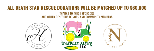 Thanks to the generous sponsorships of Handler Farms LLC, the Hanson family, the Nicholson family, and other generous donors and community members, all death star rescue donations will be matched, up to $60,000!