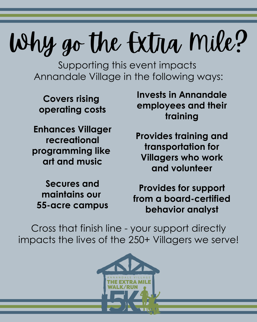 Let's work together to reach the team's fundraising goal for Annandale Village's 12th Annual Extra Mile 5K & 1 Mile Run/Walk and make a meaningful impact in the lives of adults with developmental disabilities and acquired brain injuries. Together, we can help Annandale reach its $160,000 fundraising goal!