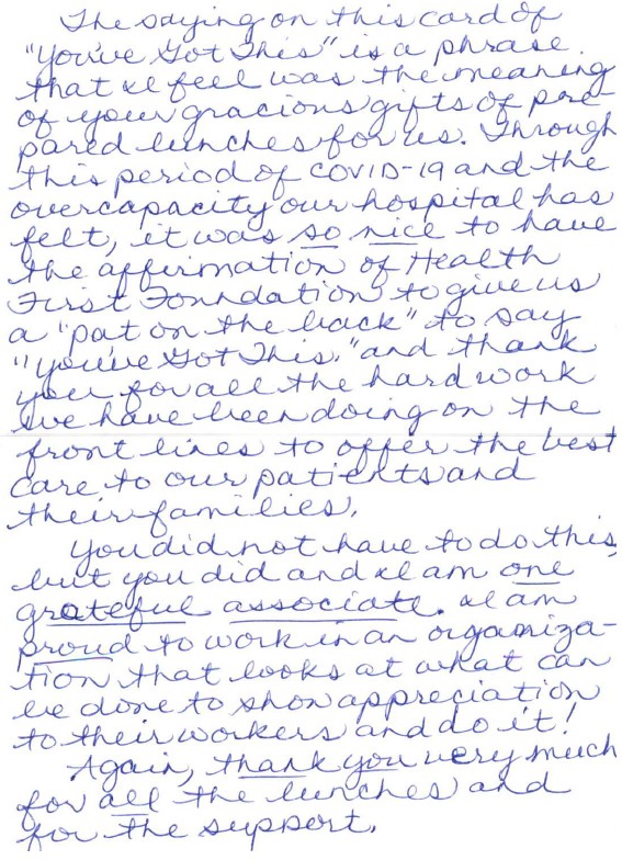 “I’ve been helping distribute some of the meals and wanted to let you know the teams are so appreciative! Sometimes we forget to give thanks, and I wanted you to know it’s a tremendous help to those on the front line who may not have time for meal breaks. Thanks to you, your team, and all of our donors!