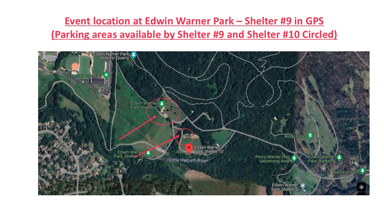 - Enter Edwin Warner Park by the 98 Vaughn Road Entrance and go about a mile until you see shelters 9. You can also input Shelter 9 in your GPS.