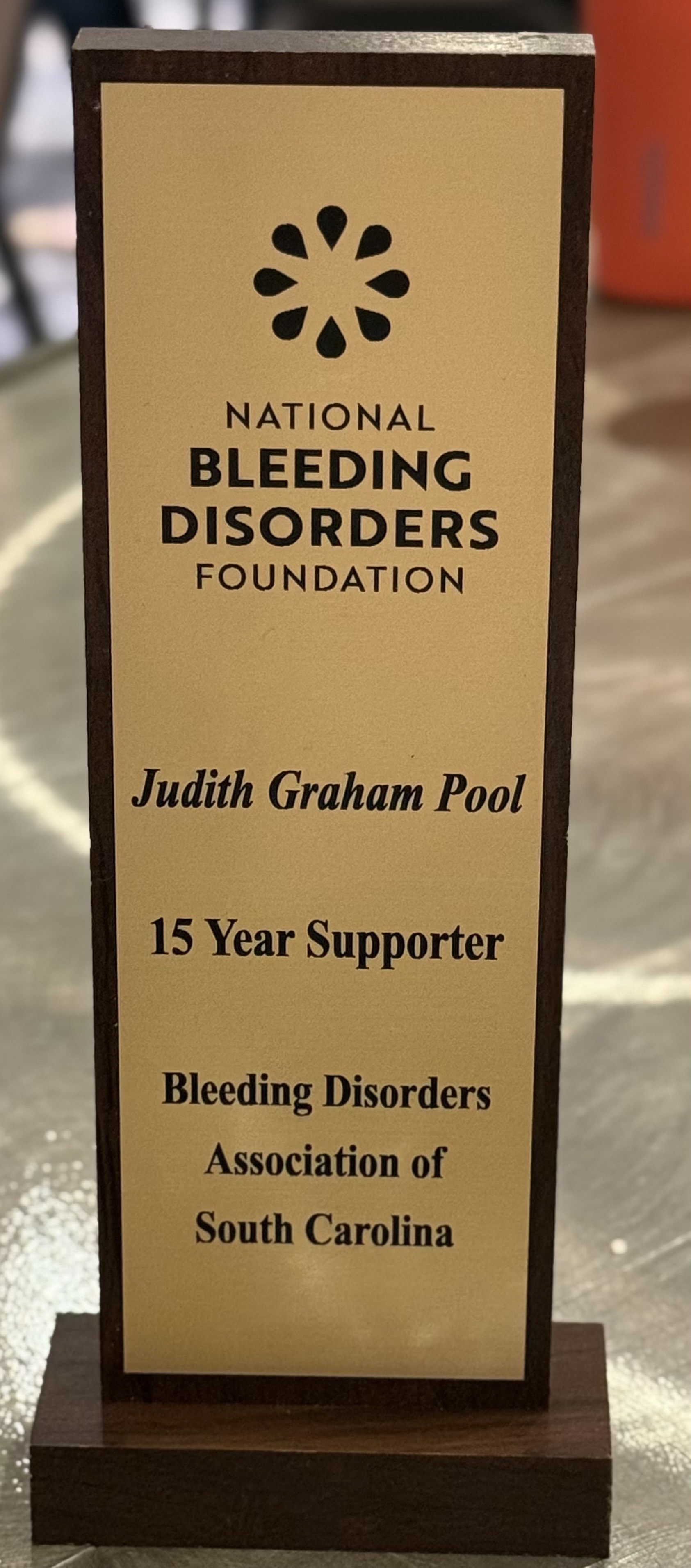Each year, BDASC provides direct funding support to the JGP through our fundraising proceeds. A small portion of the funds raised each year is donated to the JGP research in support of enhancing innovations in treatment care. Your donations allow you to have a direct hand in our hope for a cure for bleeding disorders. This year we were honored to receive an award for our 15 years of support of the Judith Graham Pool Research program from the National Bleeding Disorders Foundation. We are able to support this initiative because of donors like you. Thank you for helping support research for a cure!