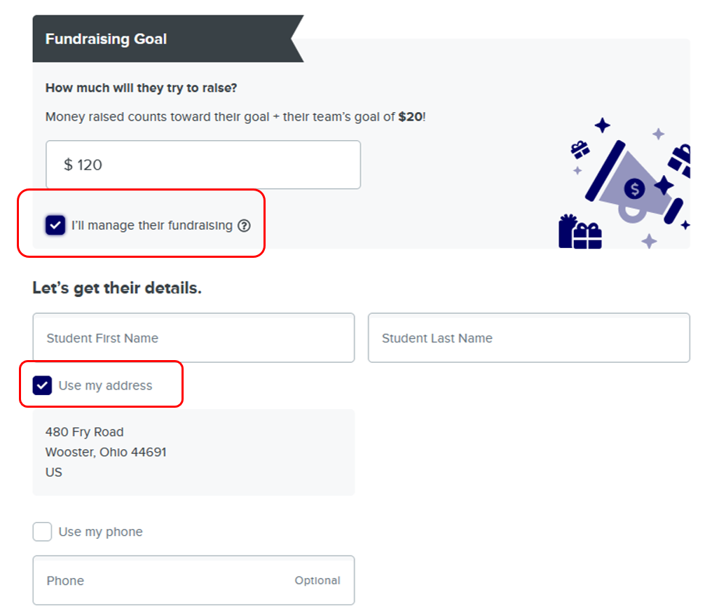 - NEXT, it is important that you check “I’ll manage their Fundraising”. If you miss checking this box the system will not allow you to register multiple students on one e-mail address.