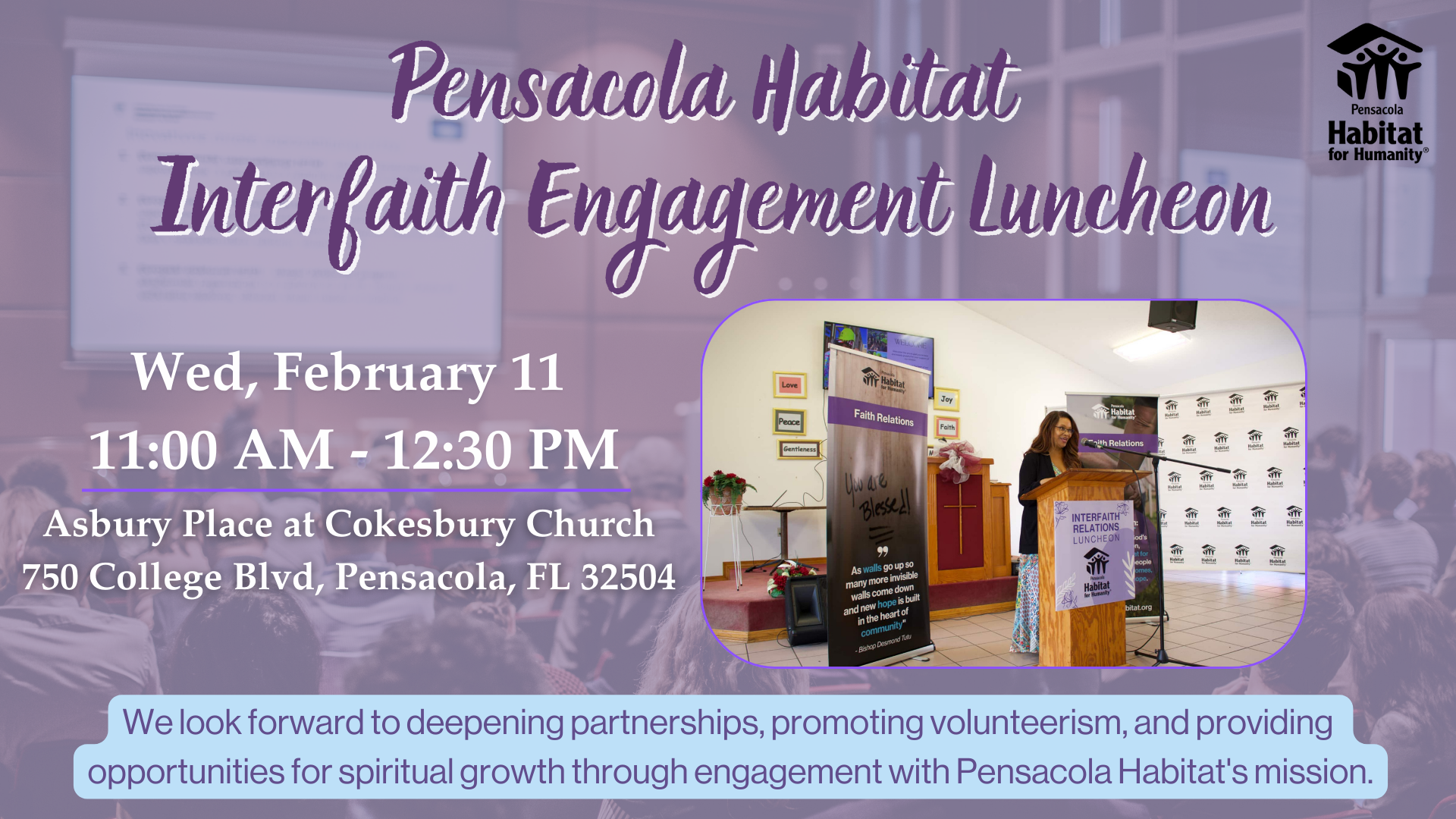 Join us for the Pensacola Habitat Interfaith Engagement Luncheon on February 11, from 11:00 AM to 12:30 PM, as we continue strengthening relationships between Pensacola Habitat for Humanity and our local faith-based community. This event brings leaders together to foster collaboration rooted in shared values of service, compassion, and community building.