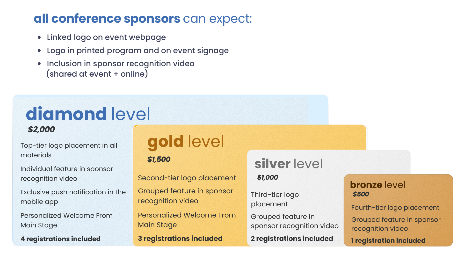 We have four levels of general sponsorship, which will look familiar if you have been part of our conference in the past. This year, we have two exclusive sponsorship levels. Find the sponsorship that is right for you and your organization!