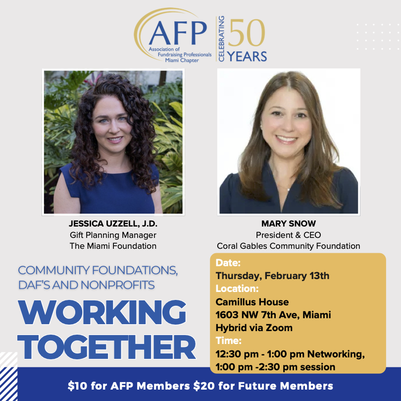 AFP Miami: Community Foundations and Nonprofits Working Together for Good! Discover how community foundations and nonprofits can collaborate to leverage the growing number of donor-advised funds (DAFs) for greater impact in our community. Panelists from The Miami Foundation and Coral Gables Community Foundation will share insights on aligning resources, engaging donors, and maximizing collective impact.