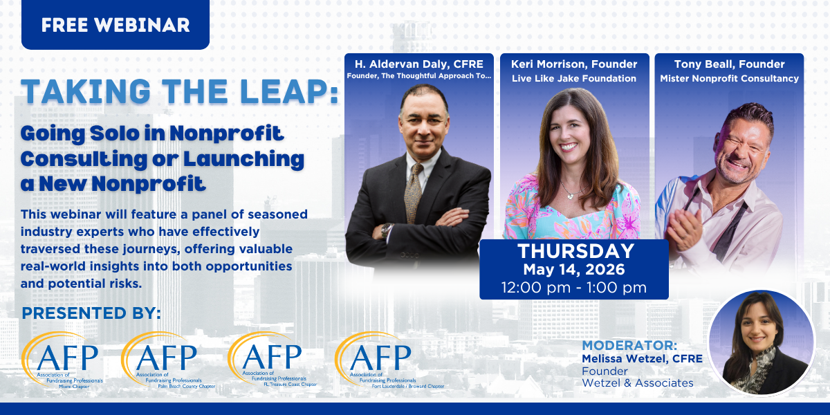 AFP Miami, AFP Broward, AFP Palm Beach County, and AFP Treasure Coast are excited to present this is high-impact educational webinar designed for nonprofit professionals who are exploring a pivotal career transition: stepping into independent nonprofit consulting or launching a new nonprofit organization. This session responds to a growing interest across the sector from professionals who are seeking greater autonomy, flexibility, and impact, while also needing candid, practical guidance before making the leap.