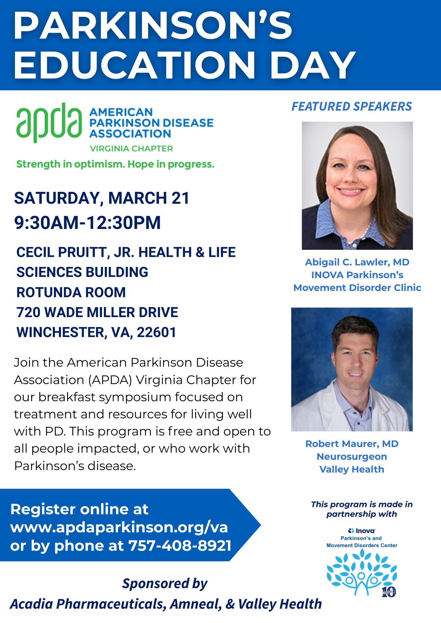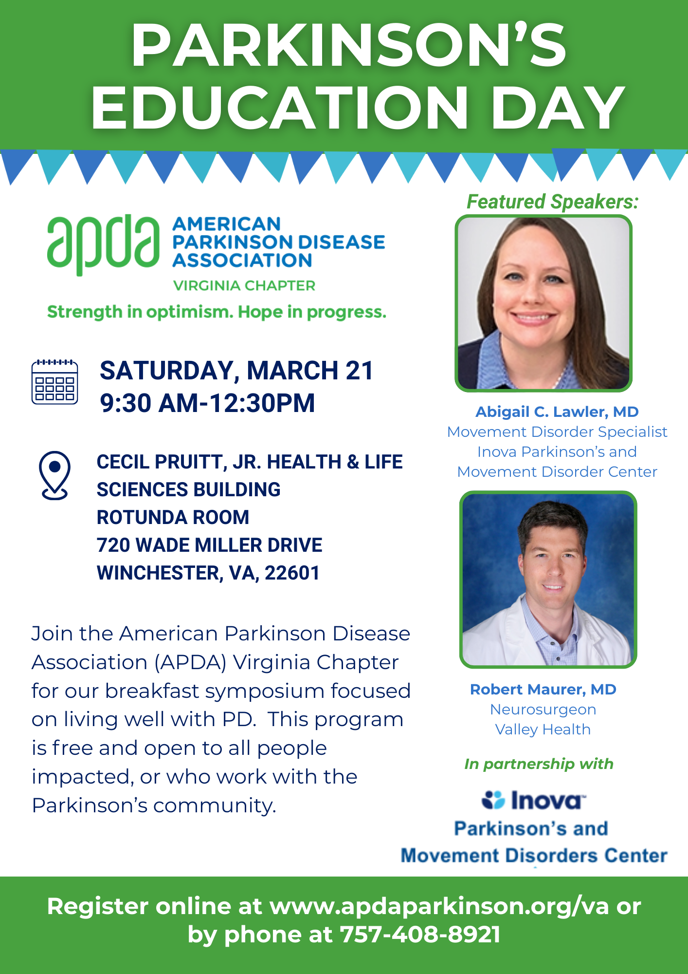 Registration is available through the online registration form or by emailing apdavirginia@apdaparkinson.org
