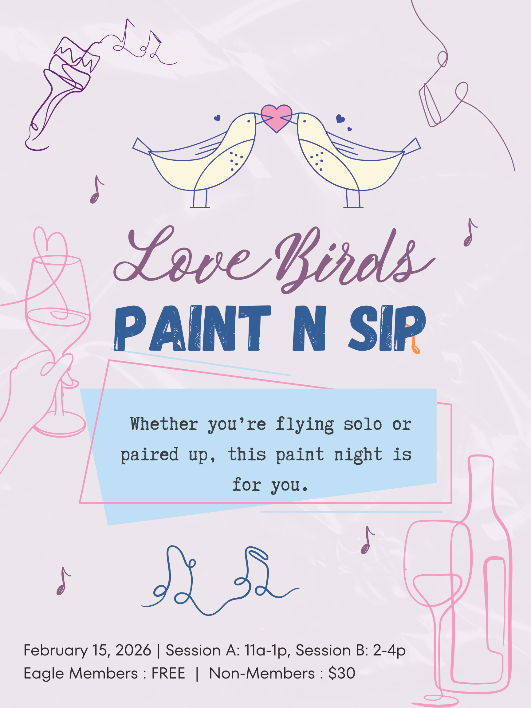 Whether you’re flying solo, gathering friends, or planning a laid-back date, Love Birds Paint N Sip is a relaxed, welcoming evening designed for everyone.