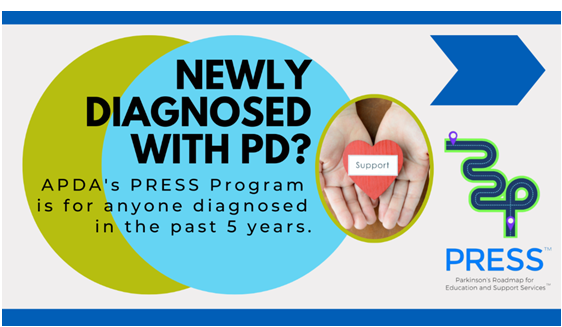 This 8-session program, APDA Parkinson Roadmap for Education and Support Services™ (PRESS), provides an opportunity for people with Parkinson’s Disease (PD) and one partner or another family member to meet with others facing a similar experience and share coping strategies regarding day-to-day issues related to living with Parkinson’s. For many people with PD, the program is a gateway into PD education, support services, and advocacy available in your community. PRESS is a place to share feelings in a safe, caring environment and gather to share information and resources. This program is facilitated by a licensed social worker, and includes guest speakers.