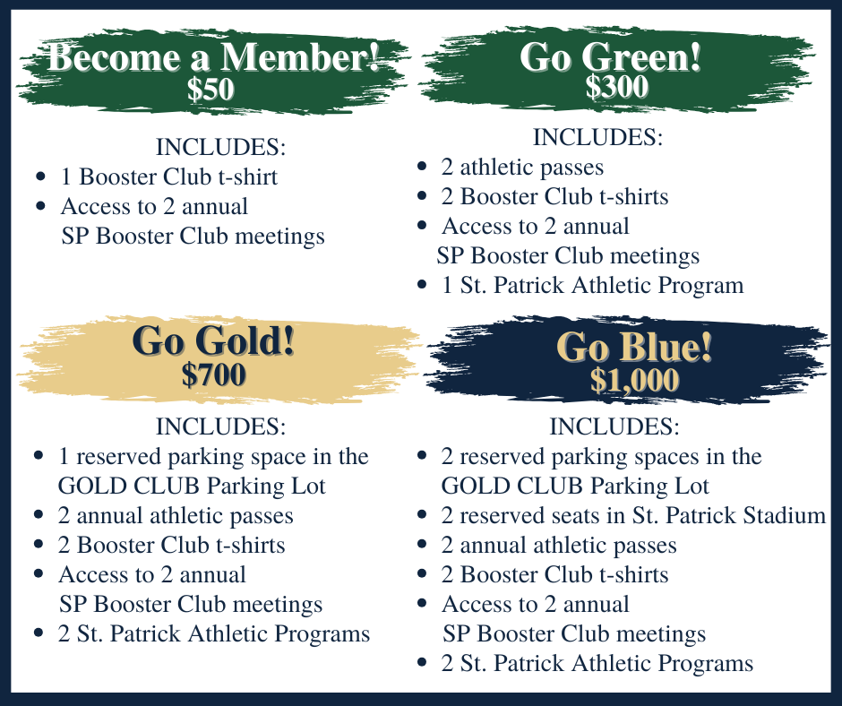 We invite you to become a member of the St. Patrick Catholic High School Booster Club today and support our Fighting Irish student athletes! Anyone who signs up to become a member of the SP Booster Club will automatically receive an official Booster Club t-shirt and access to two annual SP Booster Club meetings. You have the option to "GO GREEN," "GO GOLD" or "GO BLUE" and enjoy extra benefits, like "GOLD CLUB" parking or reserved seats in St. Patrick Stadium!