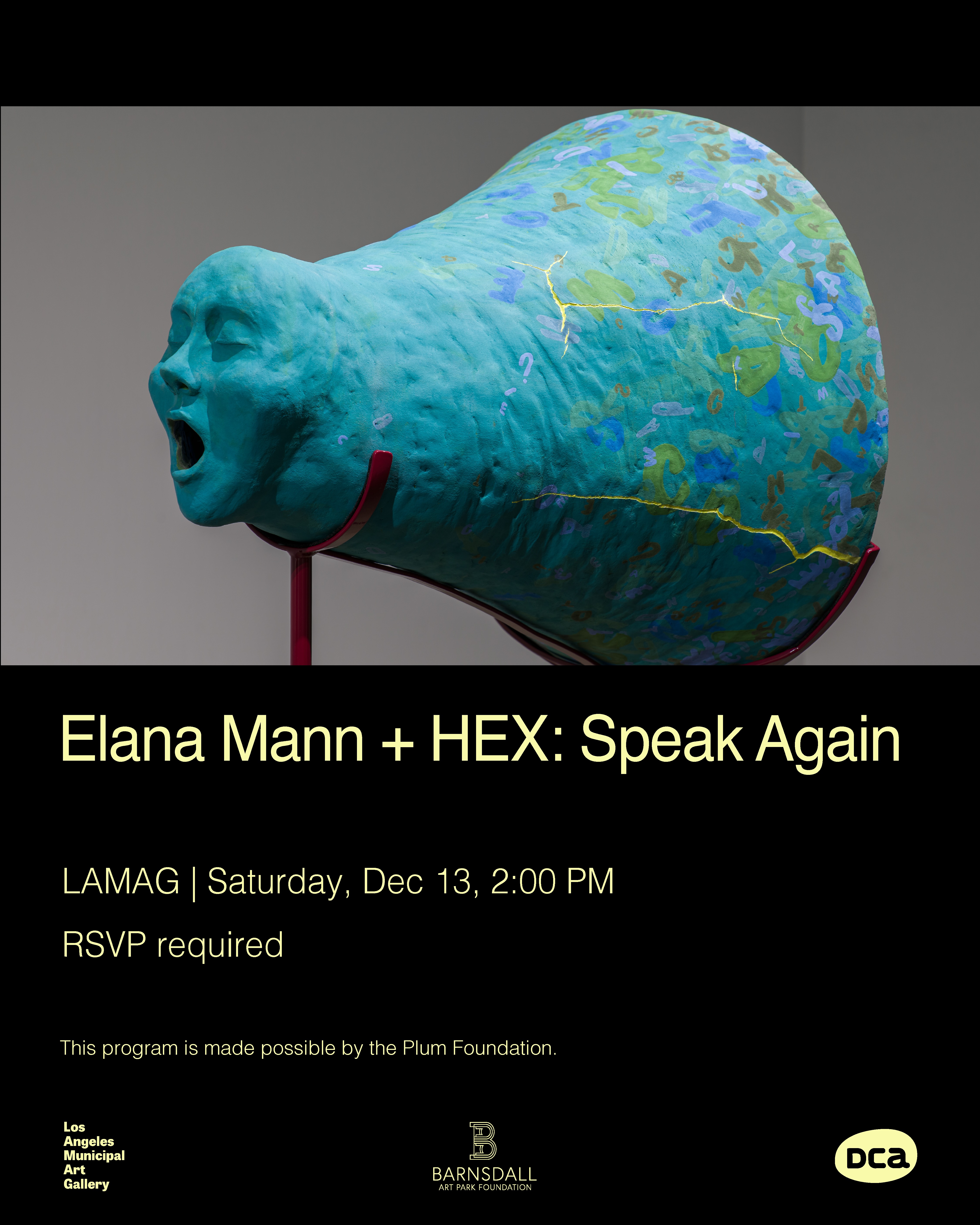 Speak Again is a collaborative assembly of performances exploring the shifting politics of hearing, listening, and speaking. Reimagining LAMAG’s gallery as a stage, the artists of HEX weld Mann’s sculptural instruments into a meditation on the subtle distinctions between sound, language, and meaning. The performance resonates with the spirit of Mann’s practice oriented around freedom of speech, the amplification of divergent voices, and the productive force of difference. Speak Again arrives at a moment of international upheaval, asking audiences to consider how listening and speaking function as critical tools for navigating an incoherent and volatile present.