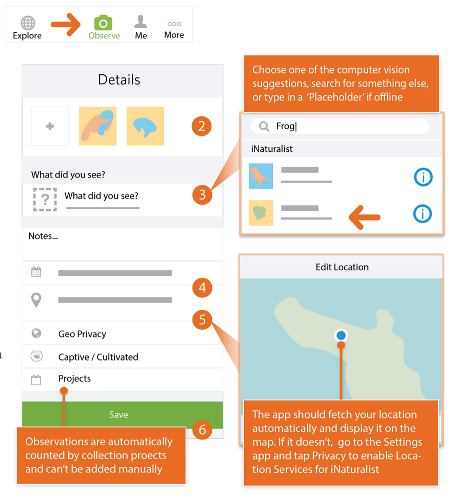 Start an observation by tapping the green plus sign in the bottom right corner of your screen (Android) or the Observe camera symbol in the bottom center of your screen (Apple).