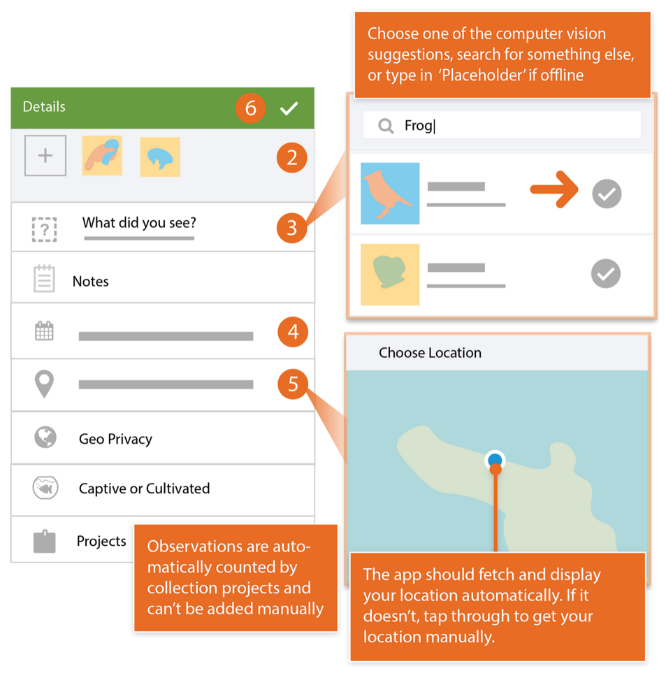 Save the observation by clicking the green checkmark at the bottom of your screen (Android) or the green Share button at the bottom of your screen (Apple).