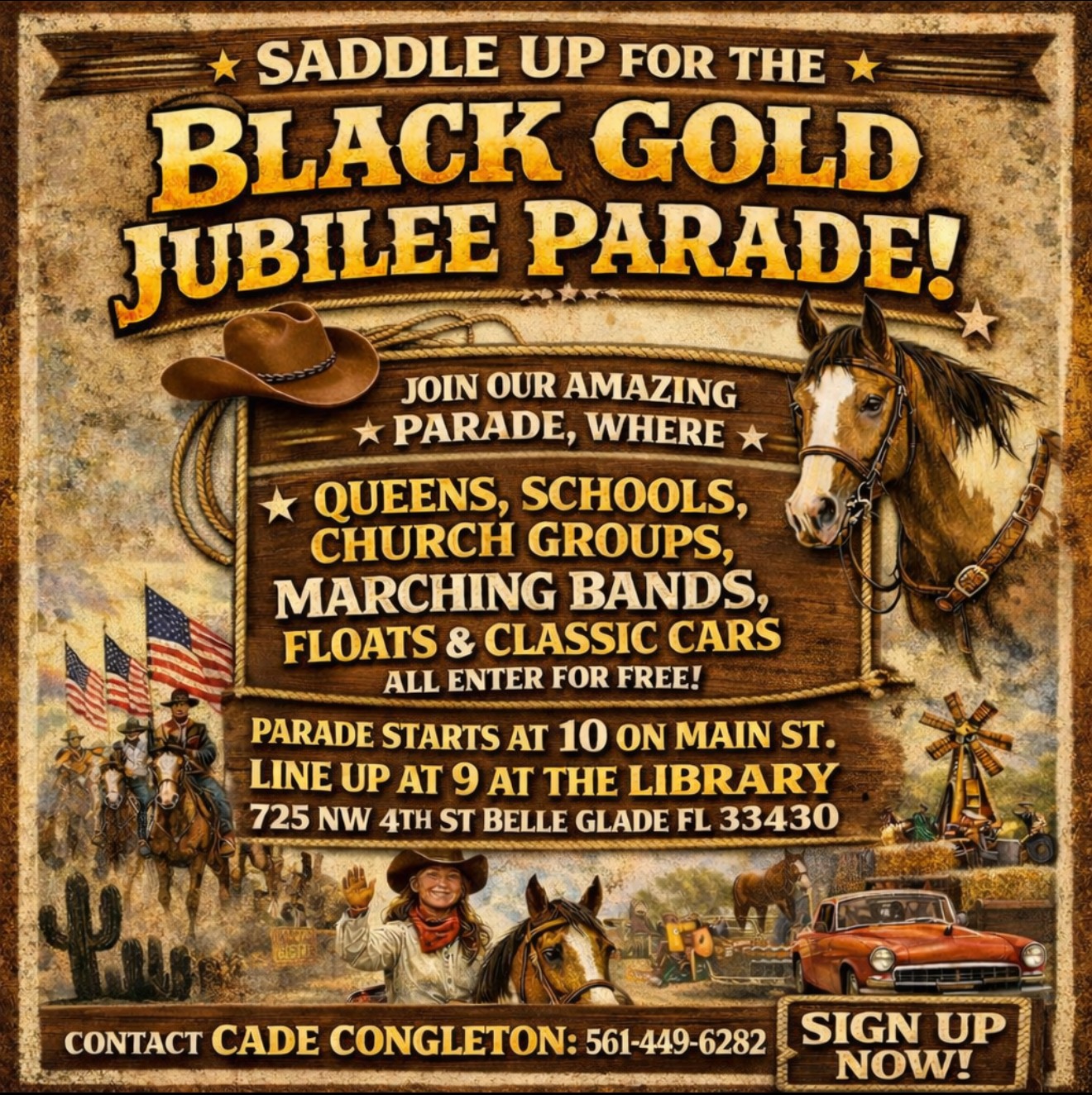 By completing this registration, you are agreeing to and accepting the rules and regulations set forth by the Black Gold Jubilee. We look forward to seeing your creativity, community spirit, and Western style on parade day!
