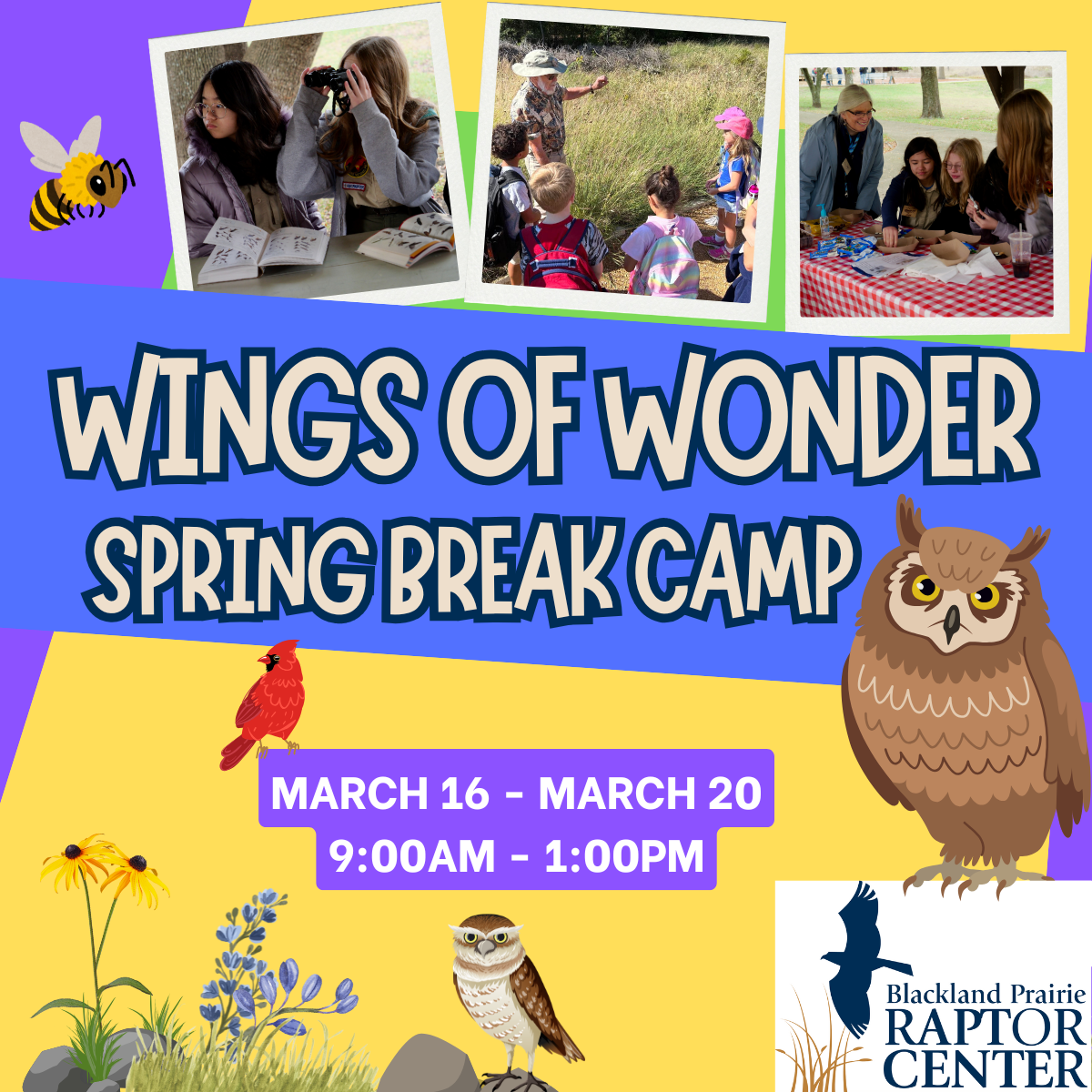 Turn spring break into an exciting outdoor adventure filled with wildlife, discovery, and hands-on fun at Wings of Wonder Spring Break Camp! Wings of Wonder Spring Break Camp puts kids right in the middle of the action! Campers will explore the outdoors, get up-close to birds of prey, and dive into creative, curiosity-sparking activities - all while having an absolute blast.