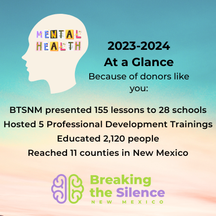 For each $5,000 raised we are able to provide 40 sessions of two “Talking Mental Health” lessons to 20 classrooms—a minimum of 400 students! $2500 sponsors 3 half-days of professional development for 25-50 staff each. Our goal is to host presentations in all 33 counties of NM and with your help we can accomplish this task.