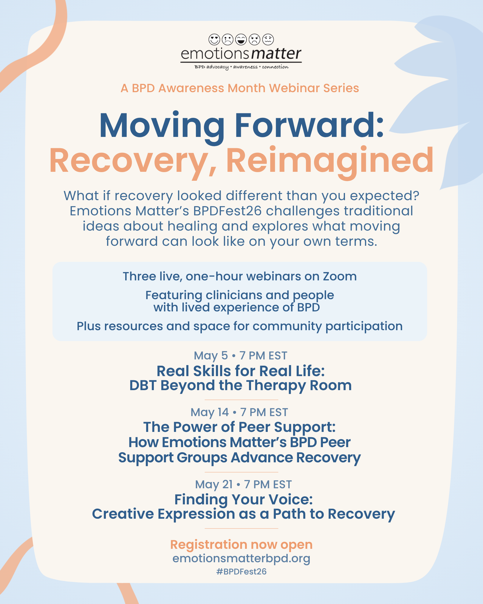 These webinars do not take the place of medical advice or treatment. There will be resources available for those seeking more information about BPD, as well as support. Registrants will be asked to complete pre and post meeting surveys to provide feedback about the group experience and help Emotions Matter learn more about the needs of the BPD community.