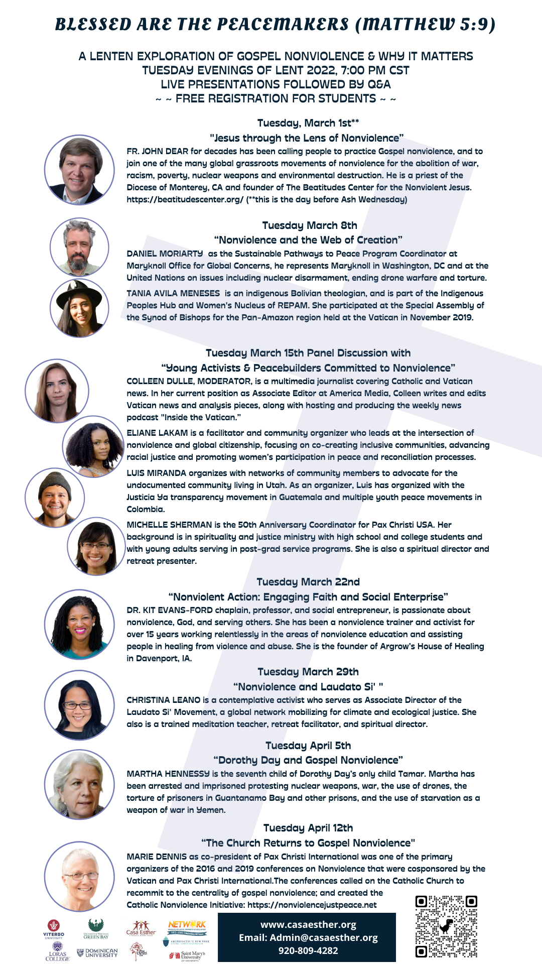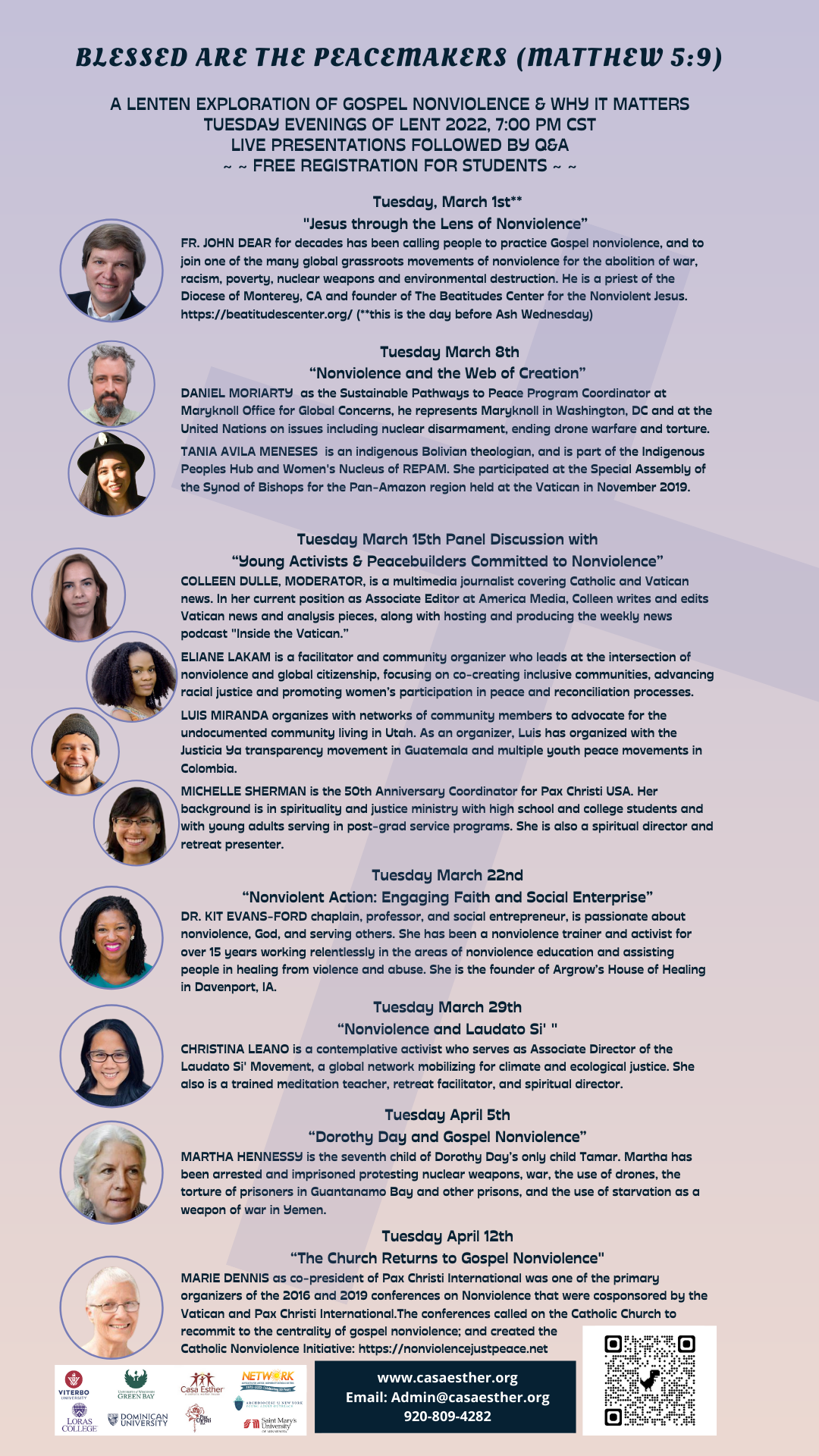 You are invited to hear from leading peacemakers, theologians and activists as we observe the holy Lenten Season. This 7-week series is offered every Tuesday evening at 7 PM CT / 8 PM ET beginning the day before Ash Wednesday, March 1st, through April 12th. After registration, you will receive an email the Monday before each event with the private ZOOM link and password for that event. PLEASE CHECK ALL YOUR MAIL FOLDERS FOR OUR AUTOMATIC RESPONSES TO ENSURE YOU RECEIVE OUR ZOOM INFORMATION.