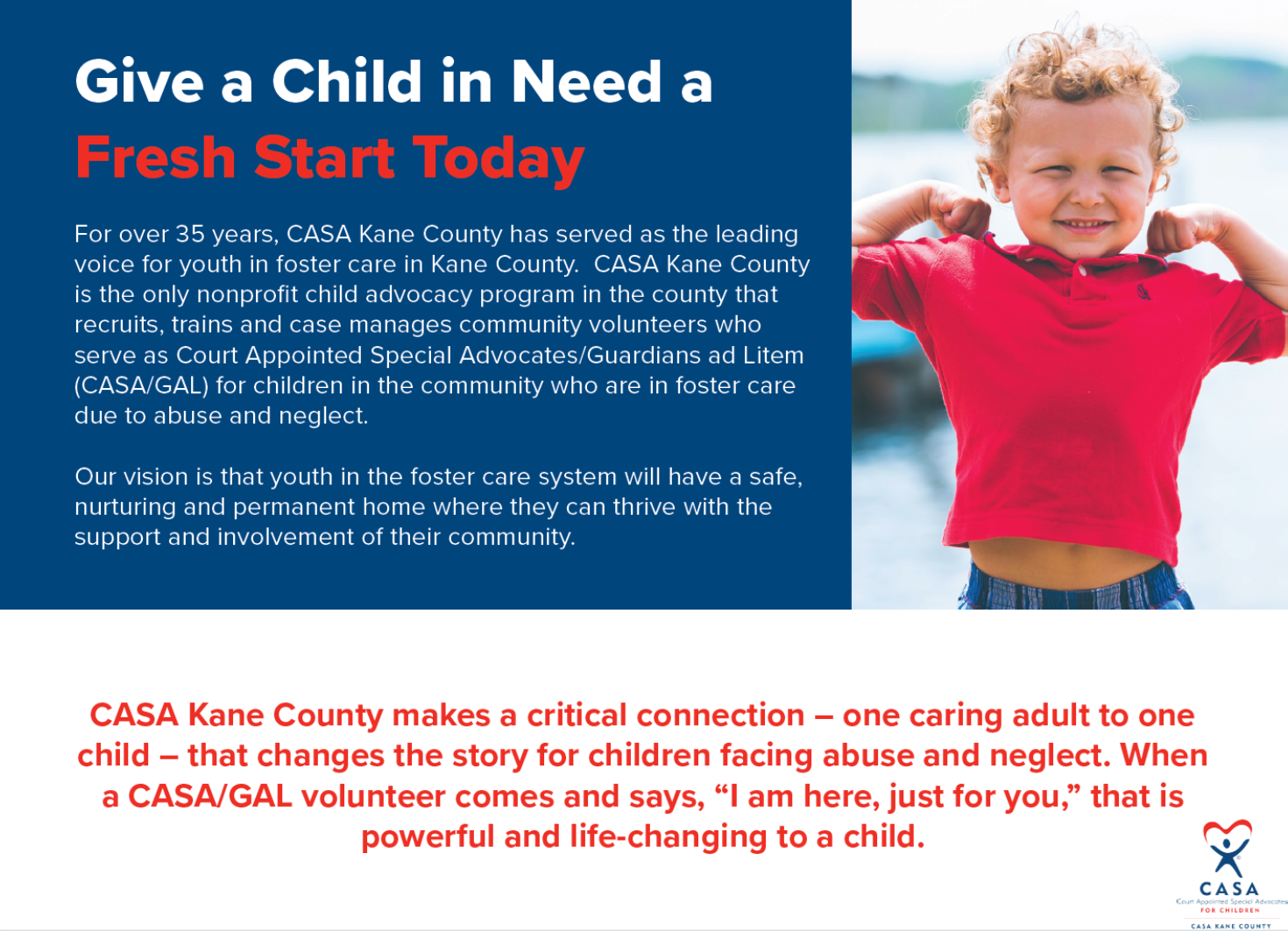 On Thursday, November 6, 2025, CASA Kane County will host our 13th Annual Super Heroes Event! This event is meant to bring together members of the community to learn more about our mission to advocate for the voices of children in foster care. Please join us to gain an understanding of the status of abuse and neglect in Kane County, the need for increased support for these precious children, and the power each of us has to help Change a Child's Story!