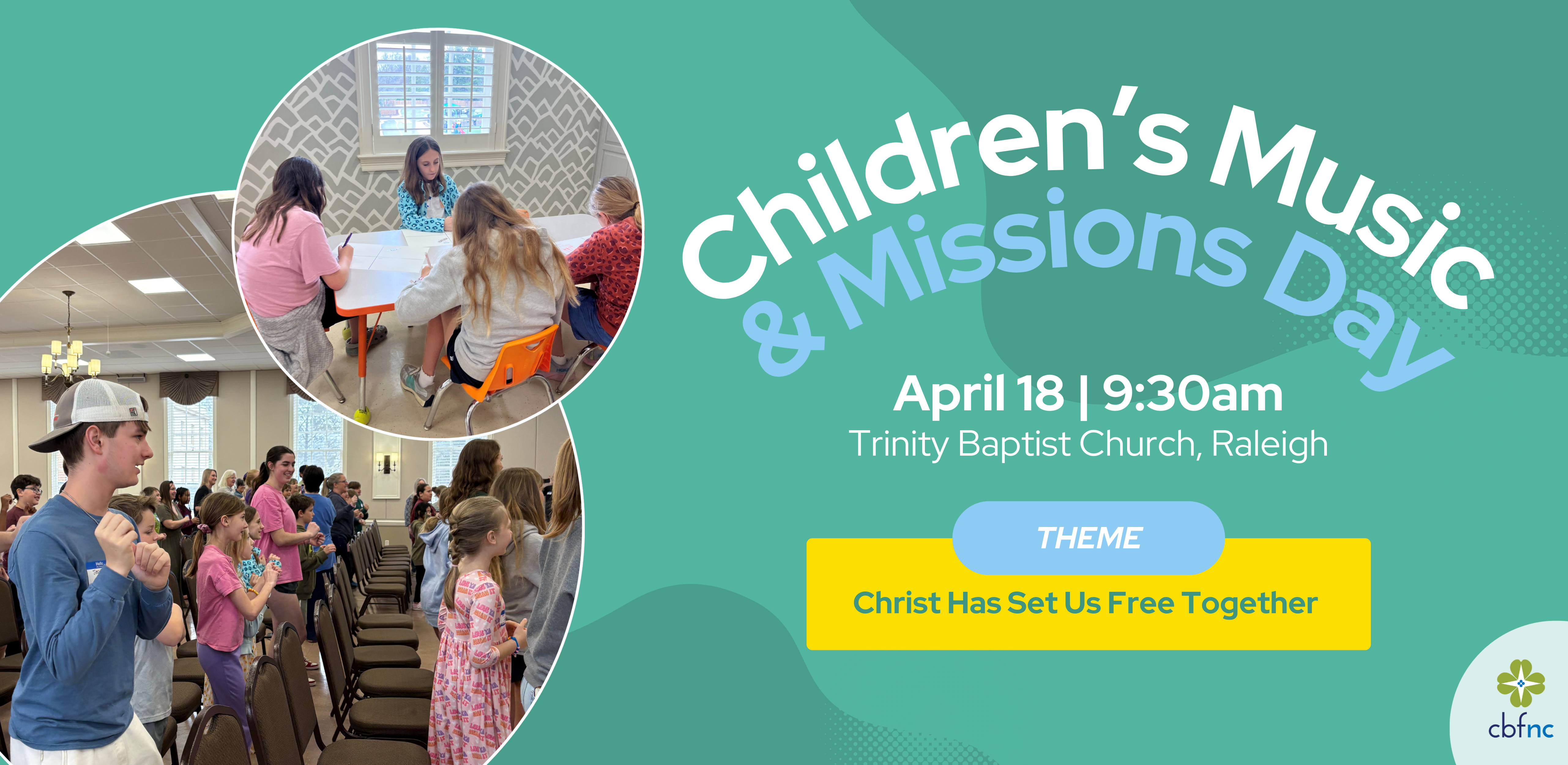 CBFNC is holding a Children's Music and Missions Day for K-5th graders on the theme of Christ Has Set Us Free Together on April 18 at Trinity Baptist Church in Raleigh.