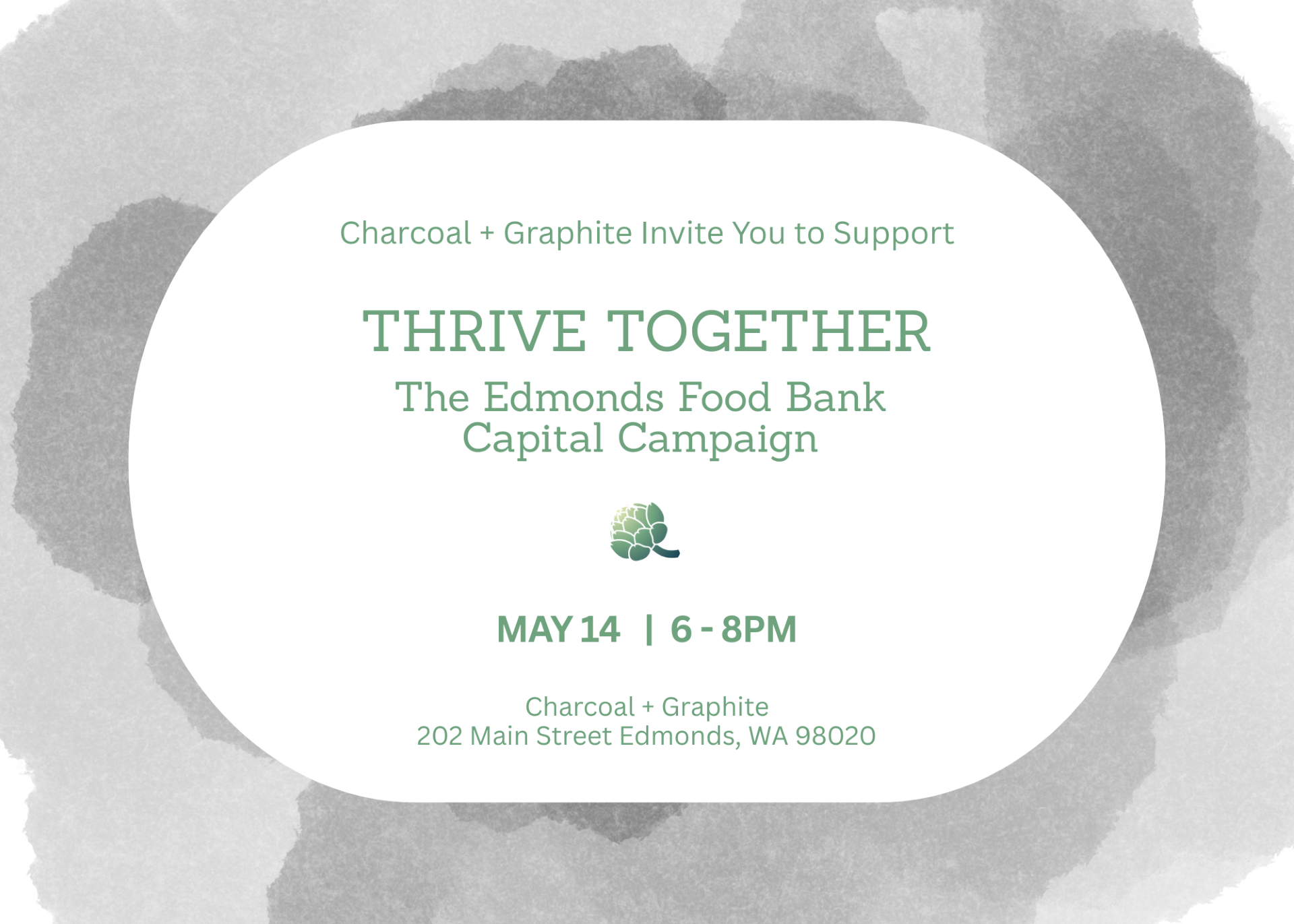 Please join us for a special evening hosted by Charcoal and Graphite to raise funds for Thrive Together, our capital campaign to build a new Edmonds Food Bank.