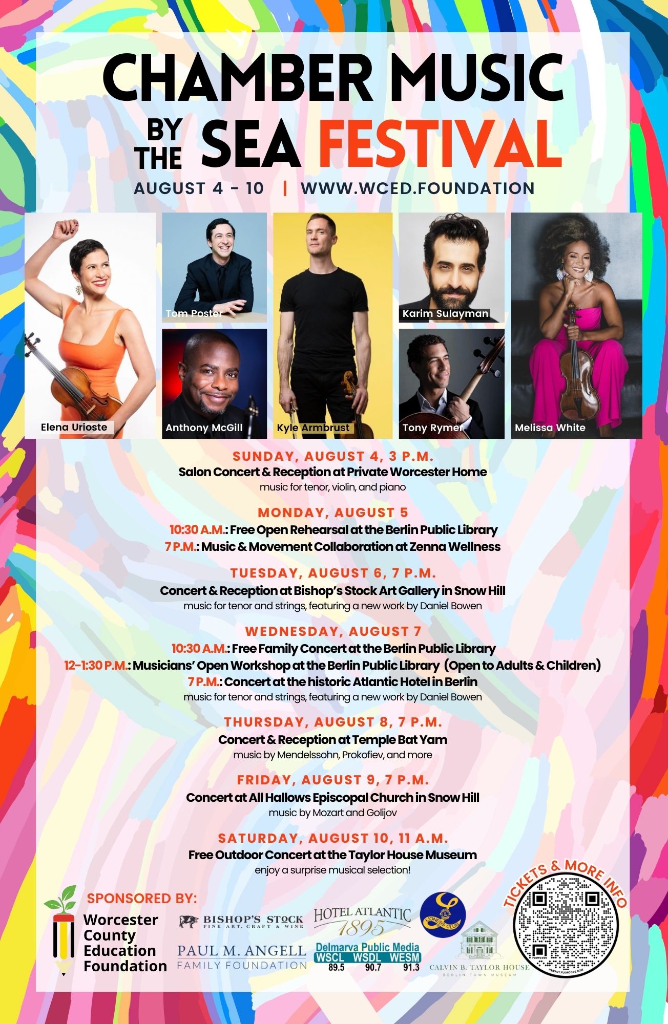 is especially excited about this year’s roster of musicians. “It’s not often that we get to meet and mingle with GRAMMY Award winners in our community, and this season we will have two of them here for the week.” Their talents will be showcased in venues that include Berlin’s historic Atlantic Hotel, Berlin Public Library, Temple Bat Yam, and the lawn of the Calvin B. Taylor House Museum, as well as Bishop’s Stock Gallery and All Hallows Episcopal Church in Snow Hill. “We want to see children dancing to Mozart and Mendelssohn as we did at last year’s family events, and to introduce music-lovers of all ages to remarkable composers who may be less familiar to them, like Prokofiev, Golijov, and Worcester County’s own Daniel Bowen, who is composing a brand new work that will receive its world premiere during the festival.” Add to that pianist and composer Tom Poster’s new encore arrangements for this summer’s musicians and a week of musical magic awaits.
