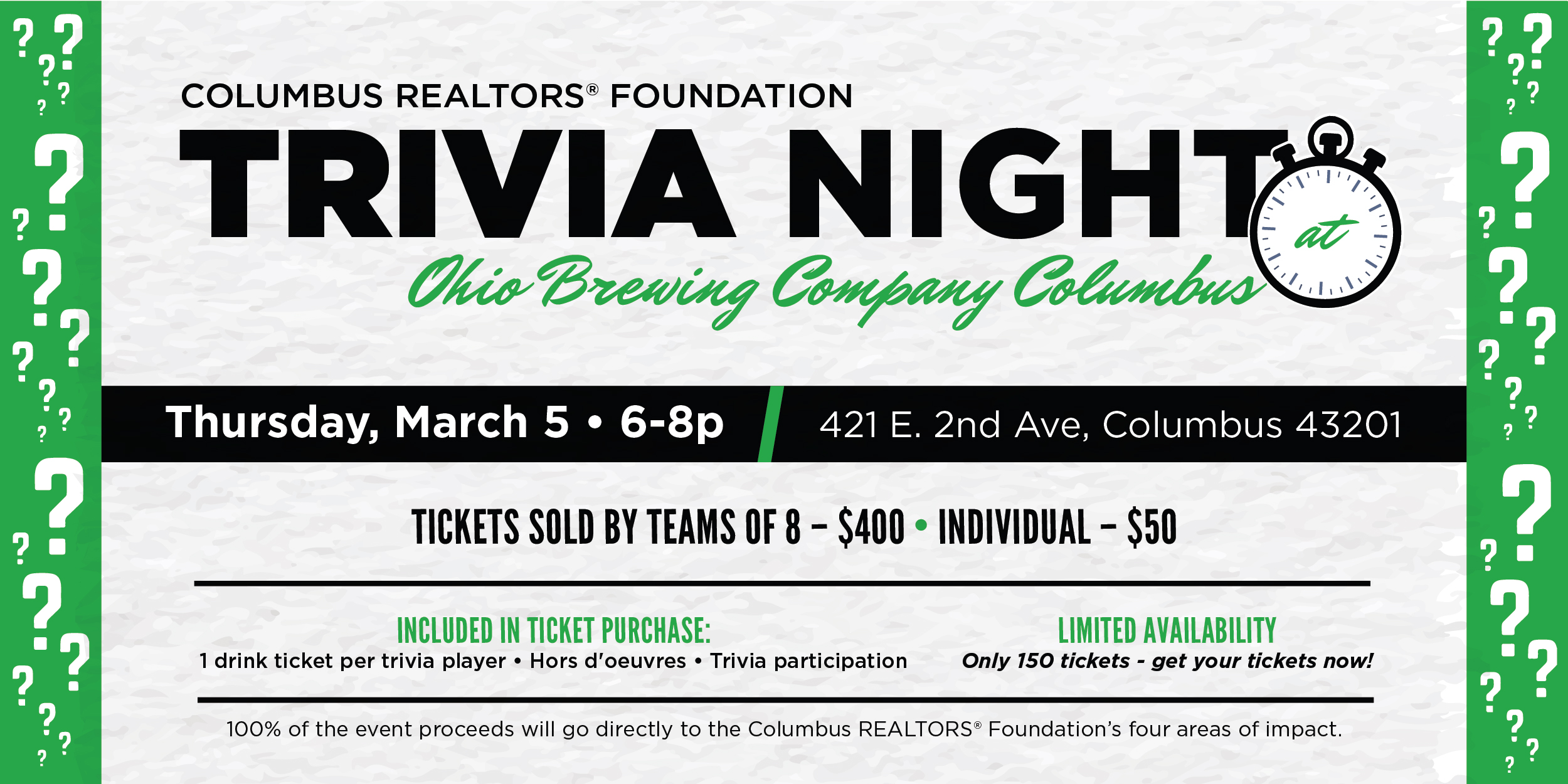 Please join us for our first ever Columbus REALTORS® Foundation Trivia Night on March 5th, 2026! All proceeds from this event go towards the Foundation's four areas of impact. Space is limited for this event! You may purchase individual tickets or a table of 8 (full team).