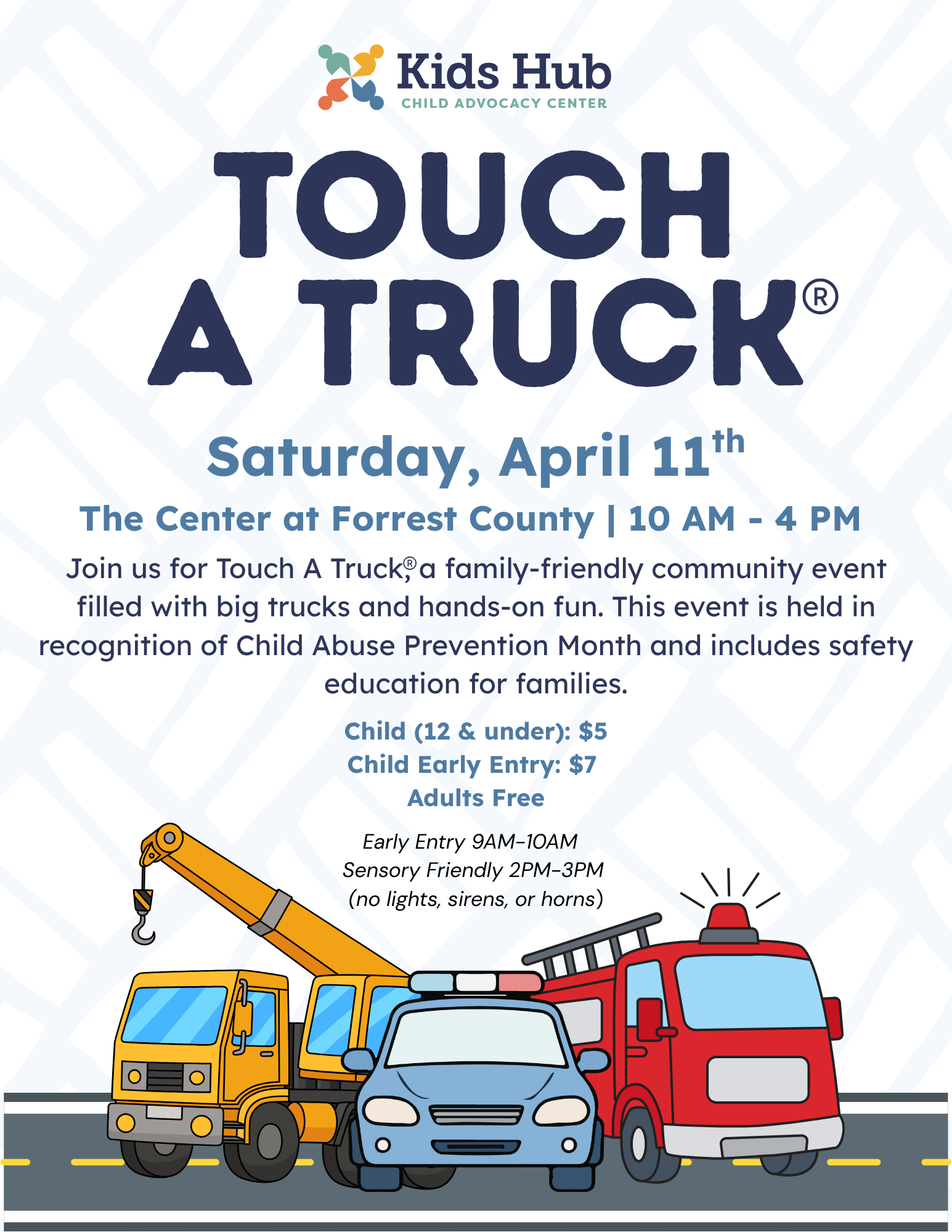 Kids Hub Child Advocacy Center is excited to host our first-ever Touch a Truck® event, a hands-on educational experience for children and families in our community held in recognition of April as Child Abuse Prevention Month.