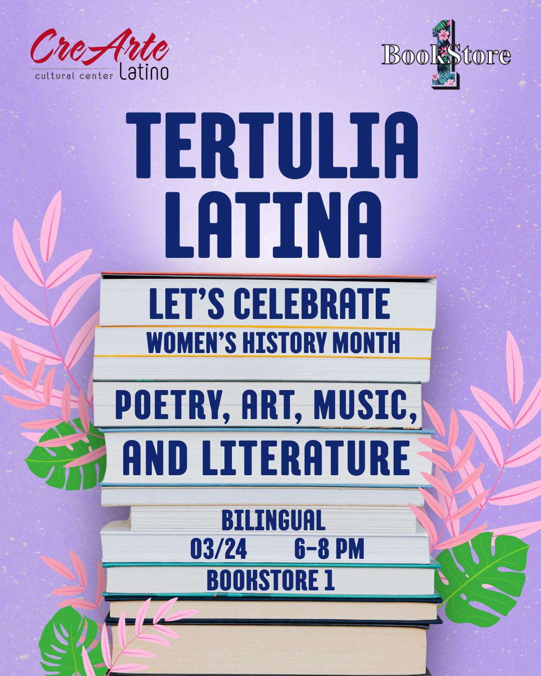 Para celebrar el Mes de la Mujer, autoras y artistas locales leerán textos propios y fragmentos de obras de escritoras consagradas de Latinoamérica, en una velada dedicada a honrar, celebrar y difundir la palabra de las mujeres escritoras. Bienvenidos a una noche de poesía, arte, música y literatura, fruto de una colaboración entre Bookstore1 y CreArte Latino. Este evento destaca las contribuciones de las artistas y escritoras hispanas a la cultura universal.Creadoras locales de diversas disciplinas compartirán lecturas literarias, poesía, música y artes visuales, generando un espacio que invita al diálogo, la reflexión y el intercambio de experiencias con el público.