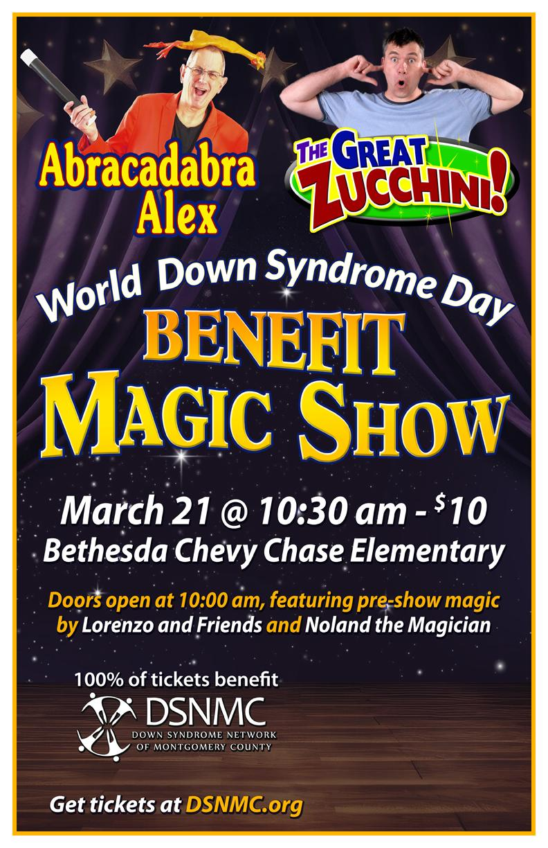 You won't want to miss this opportunity to see award-winning magicians The Great Zucchini and Abracadabra Alex perform magic tricks to delight both children and adults. Spaces are limited for this special event - register today! All proceeds from this event will support the Down Syndrome Network of Montgomery County (DSNMC).