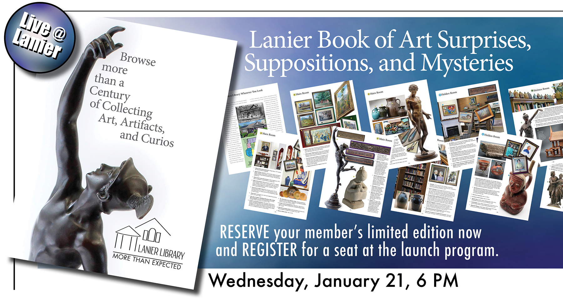 Almost a year in the making, this first edition of the illustrated Lanier Library book of art, artifacts, and curios adds color photographs of the entire collection, expands content, and revises text of two earlier editions; the most recent from 2003. Research for that earlier edition is credited to Vonda Krahn, Nowell Guffey, and Michael McCue; editing and commentary by Michael McCue; design by Caroline DuBose Bartol. For this new color edition, Executive Director, Jenny Purtill, and the Board Marketing Communications Chair, Vincent Verrecchio, relied on that earlier work as an invaluable starting point. Verrecchio, backed with more than a 50-year creative career in advertising, volunteered as copywriter, photographer, and designer.