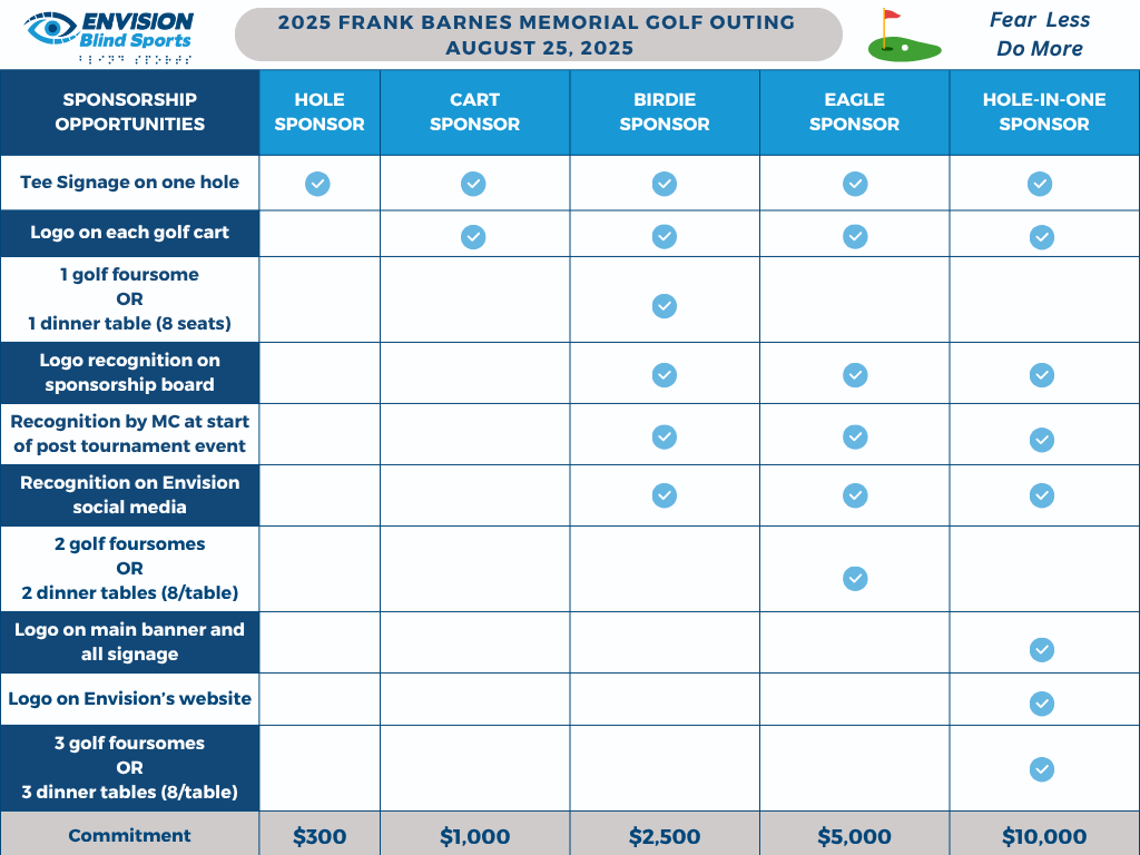 Whether you're an avid golfer or a proud supporter of Envision Blind Sports, there's a registration option for everyone. Your participation directly supports our mission: providing year-round sports and physical activity opportunities while advocating for and spreading awareness of the blind sports community.