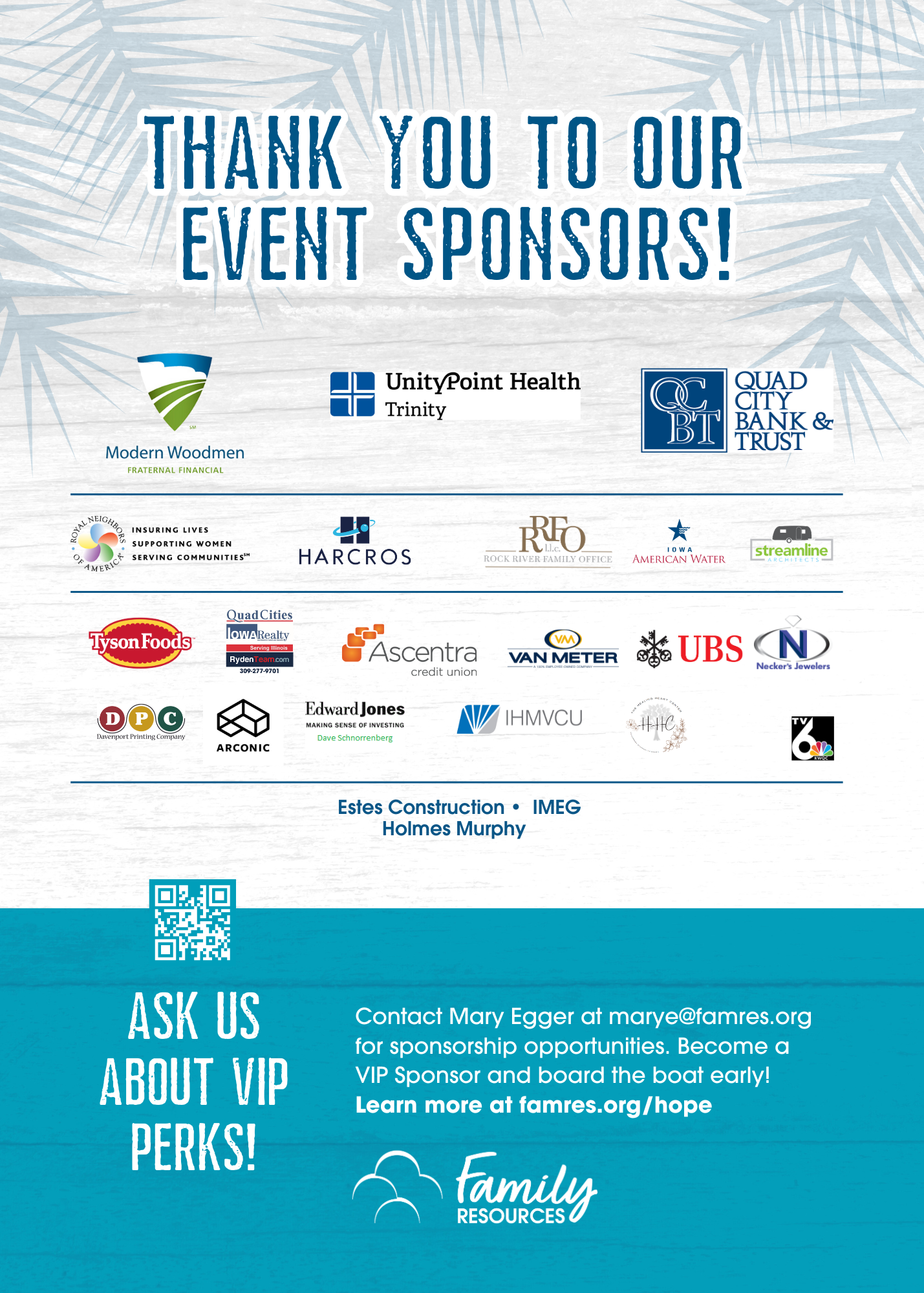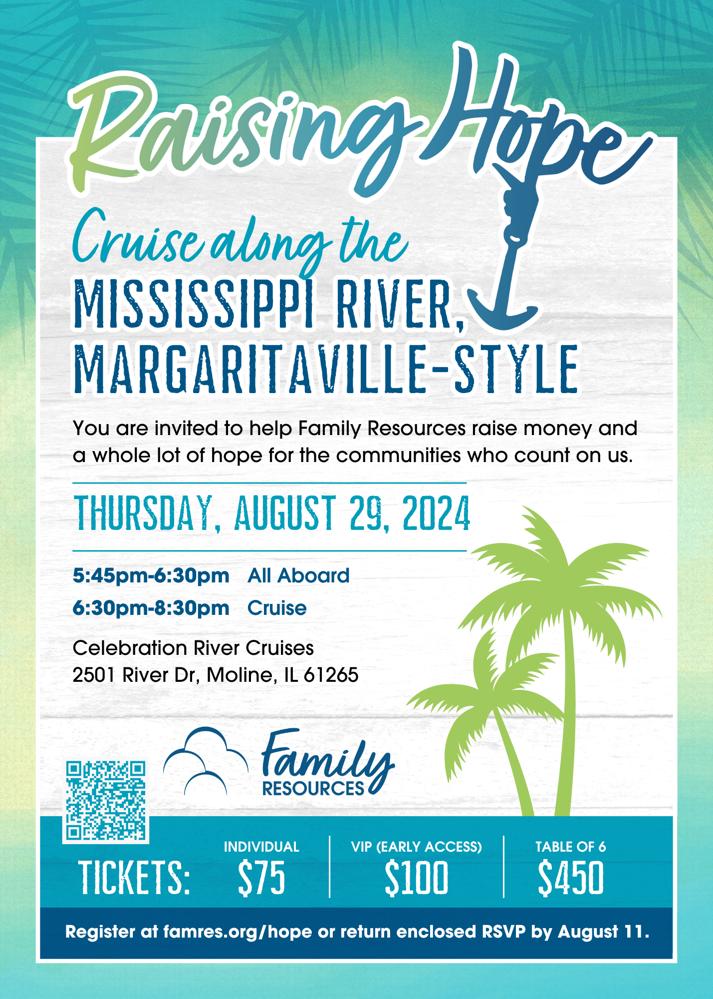 We are thrilled to invite you to “Raising Hope”, an inspiring and unforgettable evening hosted by Family Resources. Please join us on August 29th from 5:45 PM to 8:00 PM for an evening of impact and celebration aboard the beautiful Celebration Belle. As we set sail, we'll reflect on our shared achievements and envision a brighter future together. Over the past few years, we have faced significant challenges, but our resilience and the unwavering support of our partners have transformed passion into purpose and purpose into perseverance. This event will highlight our journey and showcase the transformative power of partnerships. Throughout the evening, you will have the opportunity to hear from our dedicated leadership team, including CEO Nicole Cisne Durbin, who will share stories of impact and progress. Enjoy the sunset sailing the Mississippi River, engage in a lively silent auction, and connect with others who share our vision of a safe, healthy, and inclusive community. Your presence will be a testament to the incredible community we have built together. Please RSVP by August 23rd to secure your place at this celebration of hope, resilience, and community strength. We look forward to welcoming you aboard the Celebration Belle for a night of inspiration and celebration.