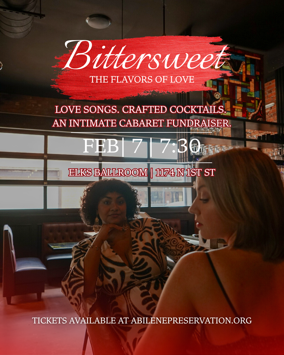 Join us for this delicious fundraiser, for the Abilene Preservation League! Singer/pianist duo Serayah Peters and Abigail Payne present "The Flavors of Love." Each set of songs will be paired with a cocktail (sweet, bitter, etc.) to enjoy as you ponder the different aspects of love.