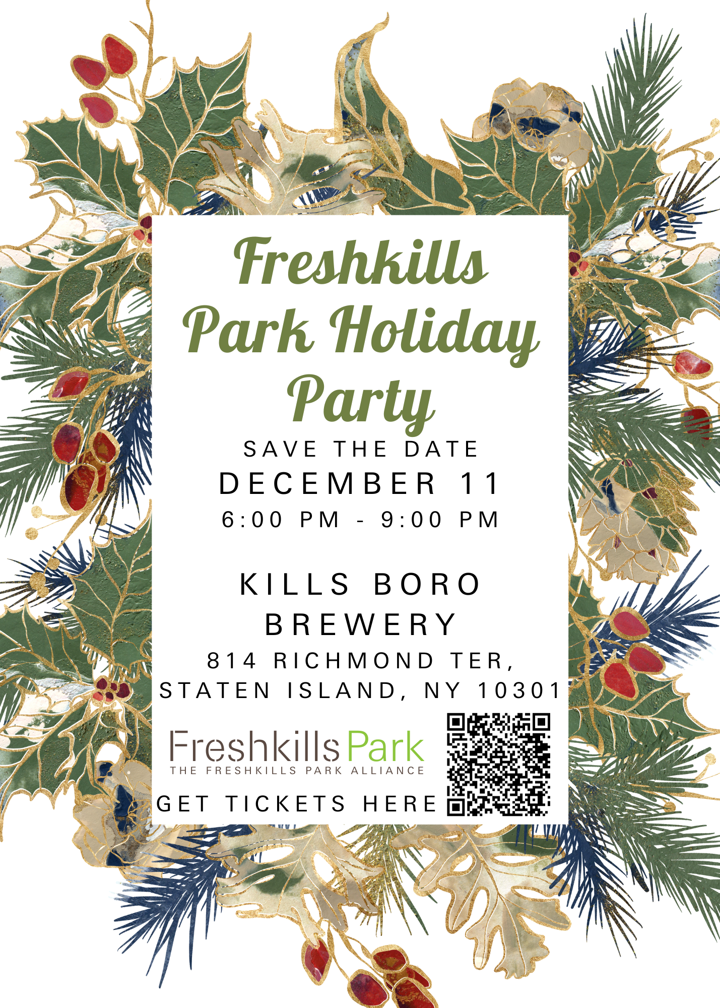 Join the Freshkills Park Alliance on Thursday, December 11, from 6:00 PM - 9:00 PM at Kills Boro Brewery for our Holiday Party!
