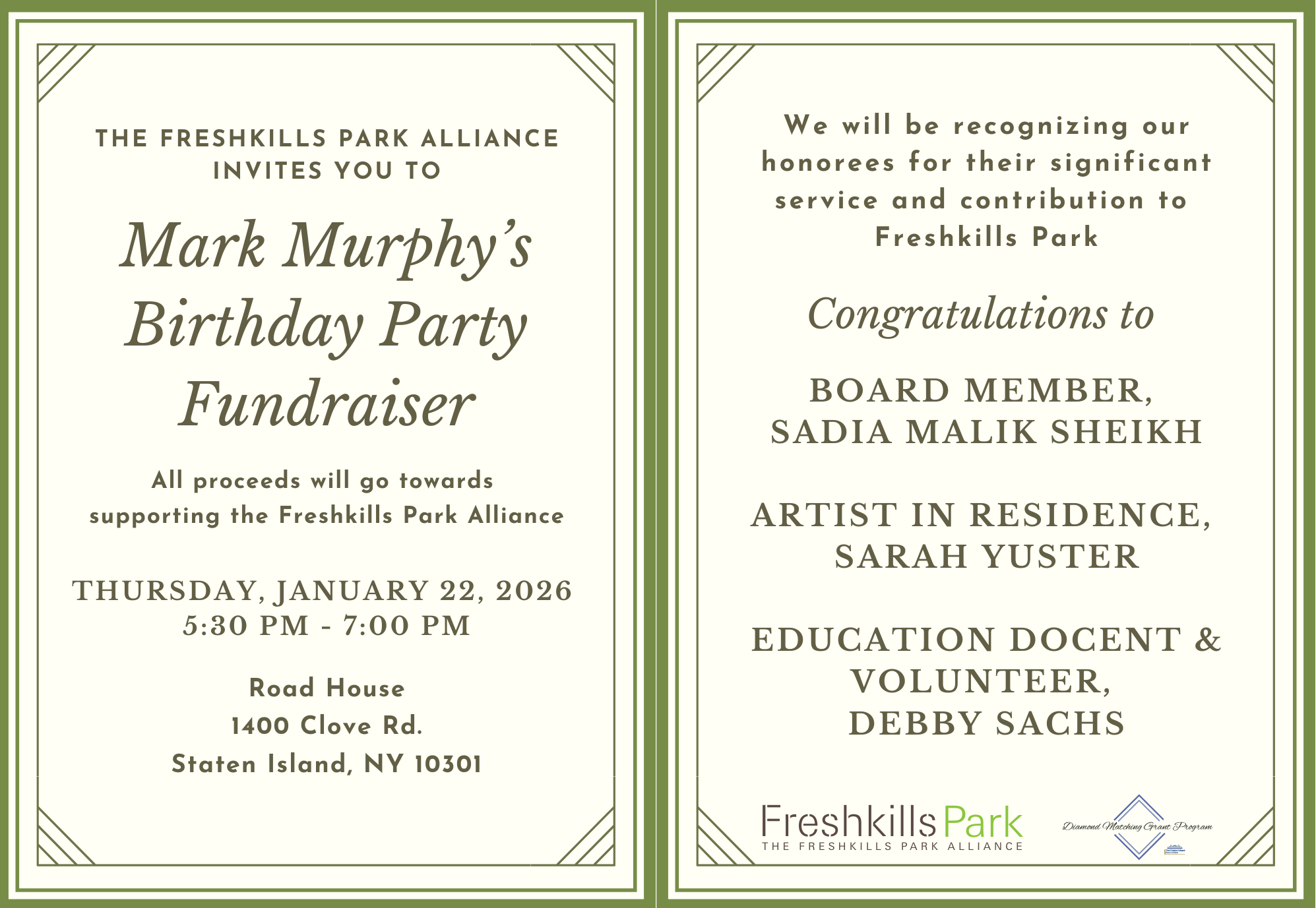 Come celebrate Mark's 55th birthday with us at the Road House on January 22nd from 5:30 - 7:00 PM! Admission includes a complimentary drink ticket, delicious food (your choice of a chicken or an eggplant entree), and a night of Mark doing Patrick Swayze impressions. We encourage you to give what you can; All proceeds will benefit science, education, and access at Freshkills Park.