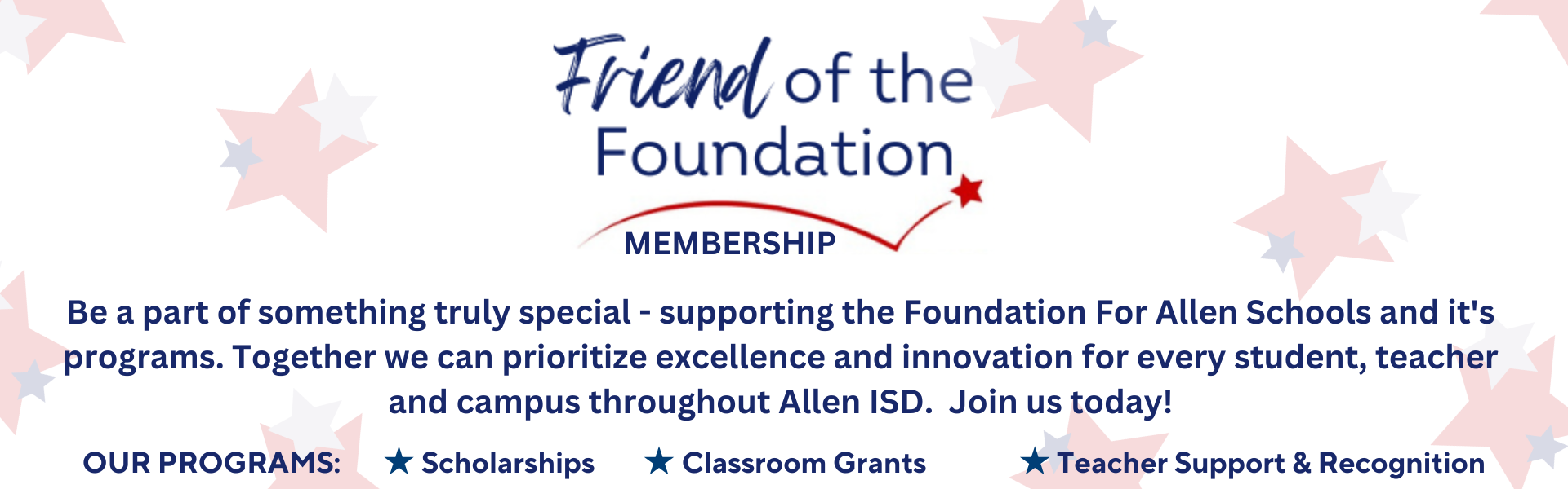 Be a part of something truly special - supporting the Foundation For Allen Schools and it's programs. Together we can prioritize excellence and innovation for every student, teacher and campus, throughout Allen ISD. Join us today!