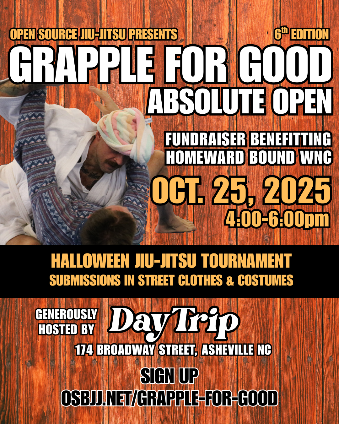 Grapple for Good is a non-traditional, fun (“not-so-serious”) Jiu-Jitsu tournament hosted by Open Source Jiu-Jitsu to benefit Homeward Bound of Western North Carolina. While the tournament itself follows a more traditional rule-set, competitors are encouraged to get creative with their attire and have fun while competing in a friendly manner to help better serve less fortunate members of our community.