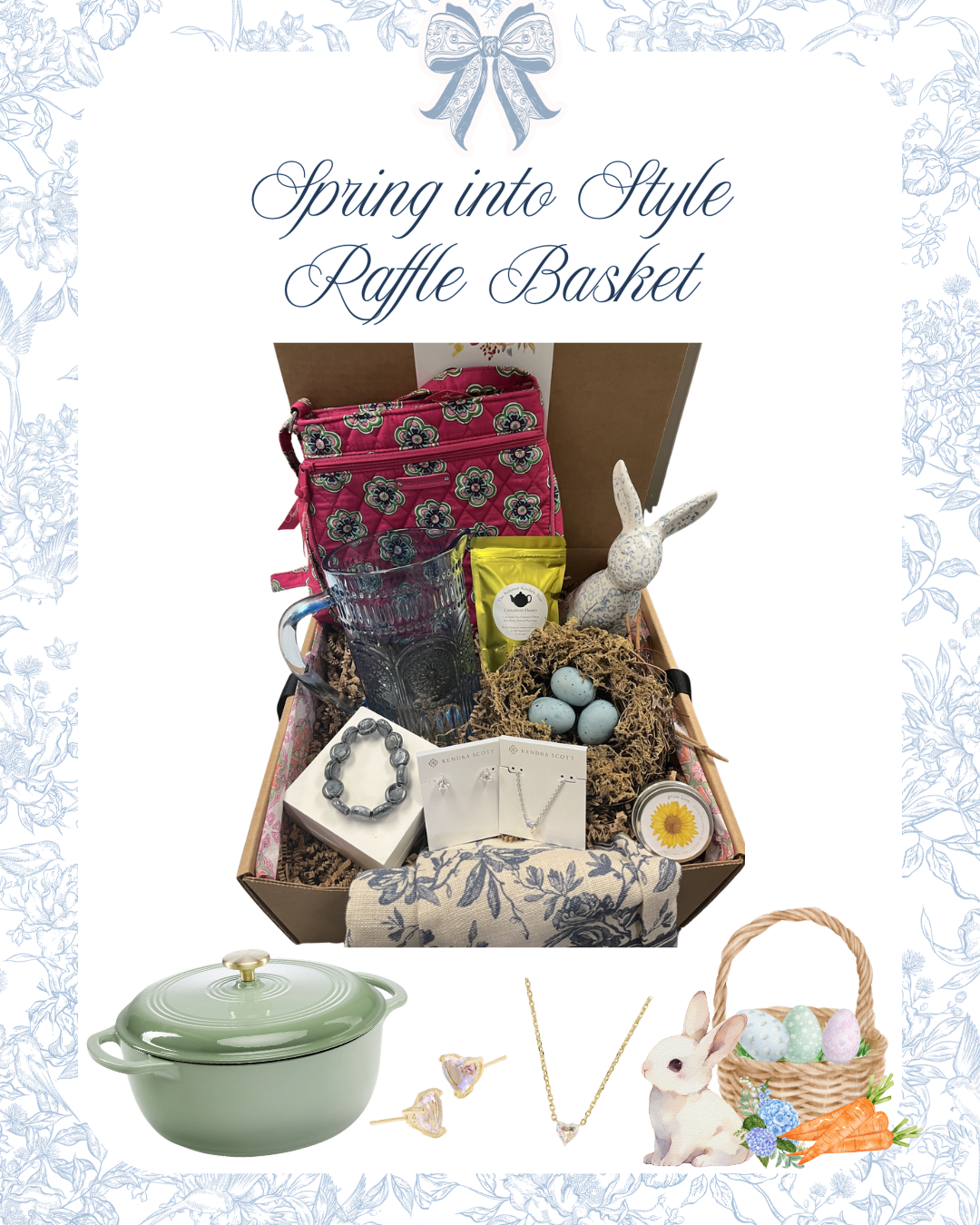 Celebrate the season with our beautiful Spring Into Style Raffle Basket, valued at $350+! This thoughtfully curated basket is filled with charming spring essentials, including a Best Choice Products Cast Iron Dutch Oven in Sage Green—perfect for cozy cooking and entertaining. You’ll also find a Kendra Scott Ayla heart pendant necklace and matching earrings, adding a touch of sparkle to any outfit, along with a Vera Bradley pink floral crossbody bag that’s both stylish and practical for everyday use. To complete the basket, we’ve included lovely spring-inspired goodies for your kitchen and home décor, like a decorative glass pitcher, tea, a cozy floral towel, a sweet bunny accent, and other seasonal surprises. It’s the perfect mix of spring charm, style, and everyday treats—a basket you won’t want to miss!
