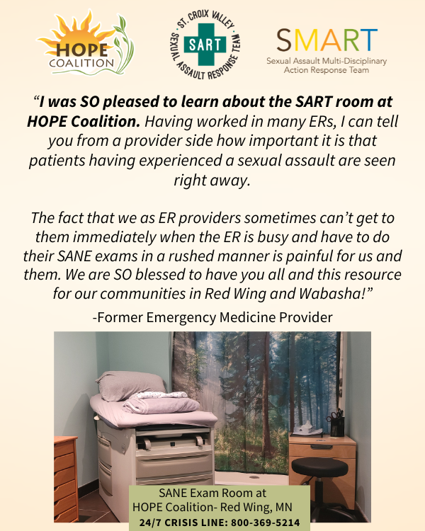 An advocate contacted her immediately, informing her about the available SANE exam room in HOPE’s Red Wing office, where a forensic medical nurse was ready to assist. HOPE provided support throughout the exam and arranged for her to stay in a hotel for a few nights afterward.
