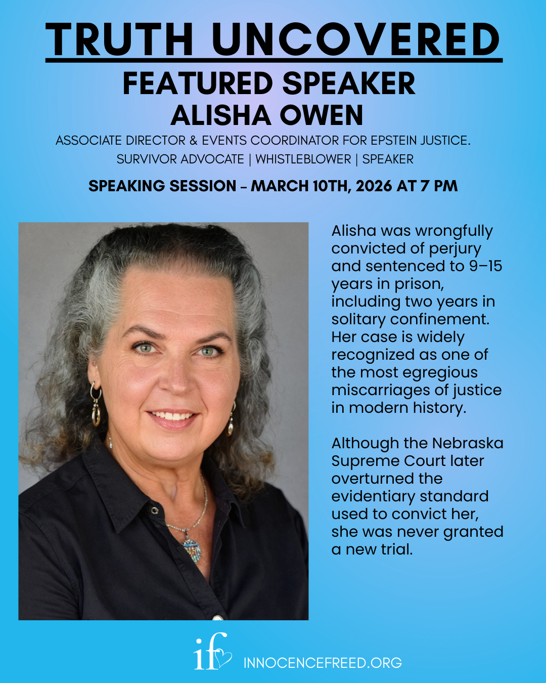 Speaking Session – March 10th, 2026 Featuring Speaker Alisha Owen, Associate Director & Events Coordinator for Epstein Justice. Survivor Advocate | Whistleblower | Speaker