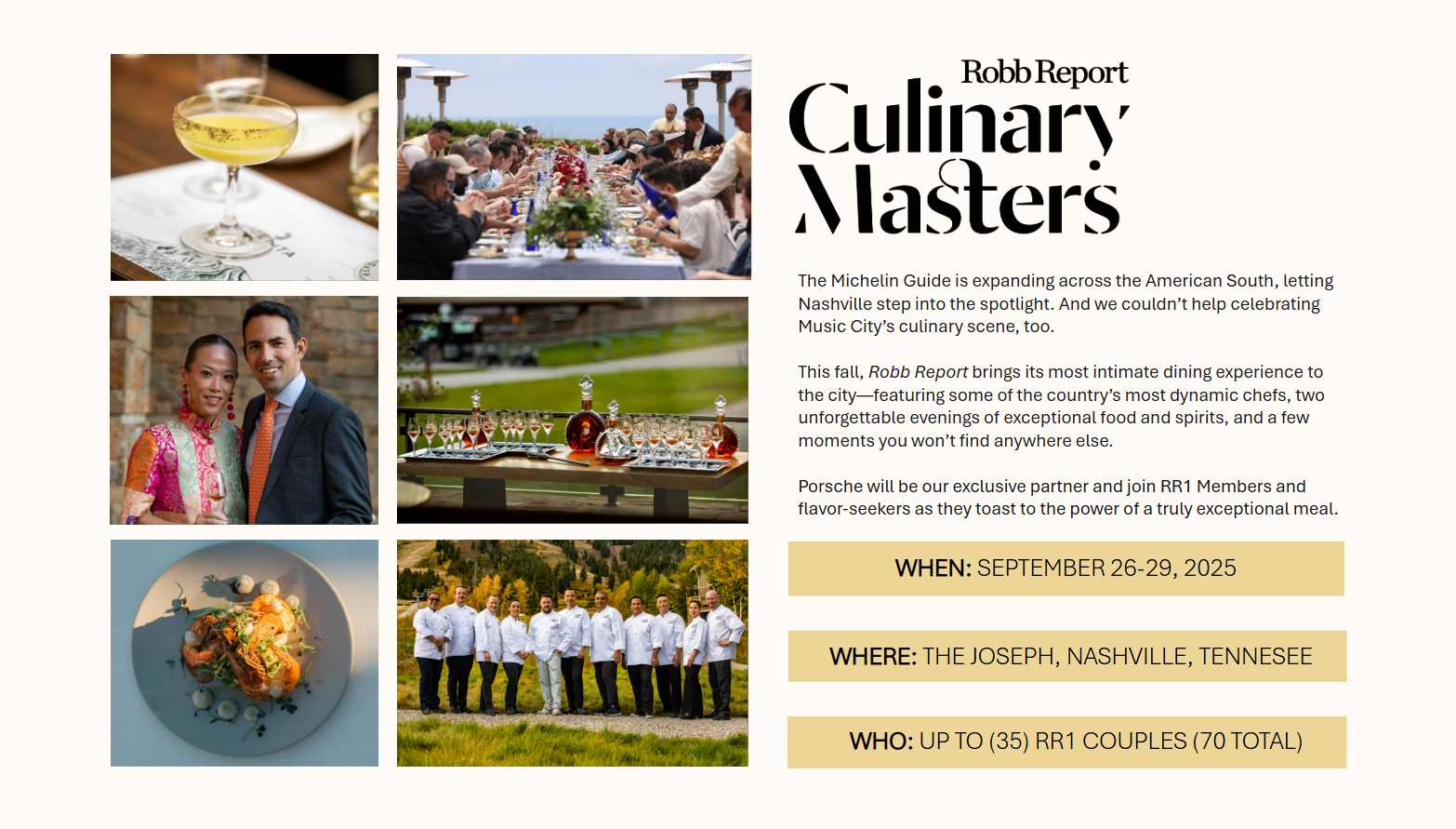 Robb Report gathers the nation's most brilliant culinary minds for an unparalleled epicurean retreat to celebrate the Michelin Guide coming to the South. Nashville is the culinary hotspot of 2025, thanks to its debut in the prestigious Michelin Guide this April. Known for its diverse and innovative food scene, Nashville offers everything from creative pasta dishes to mouth-watering barbecue—all of which guests will be able to savor.