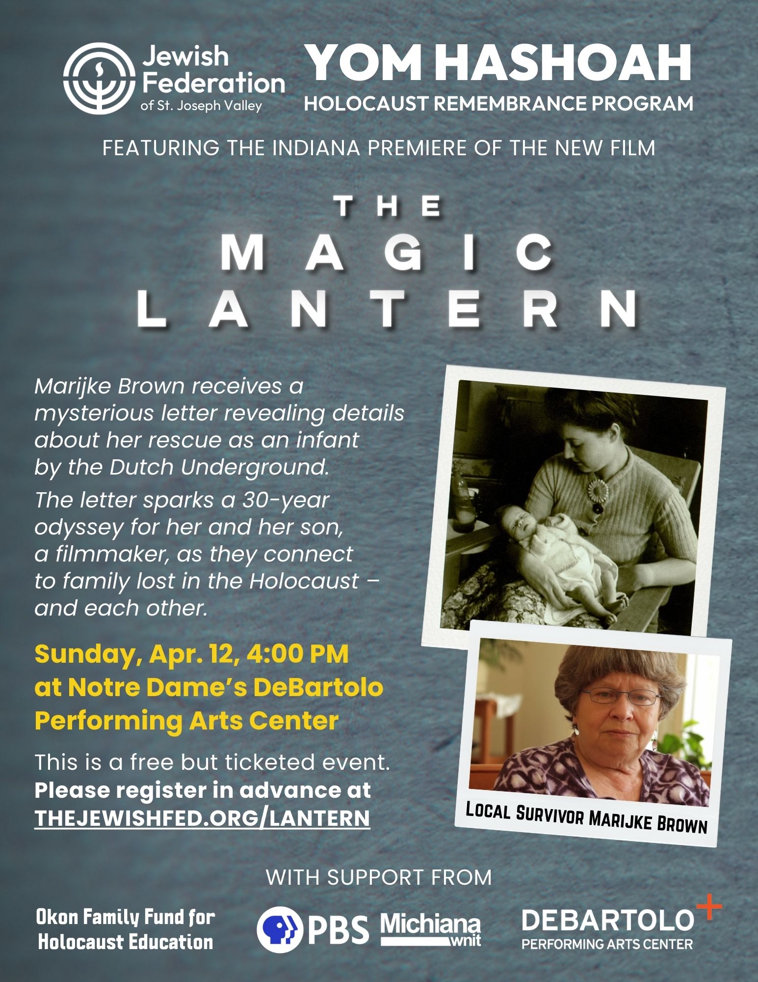 Honor the victims, survivors, and heroes of the Holocaust during our community's annual Yom HaShoah Holocaust Remembrance Ceremony, this year held at the University of Notre Dame's DeBartolo Performing Arts Center and featuring the Indiana premiere of documentary The Magic Lantern, chronicling the story of local survivor Marijke Brown. Following the film, director Eli Brown will participate in a talkback with the audience.