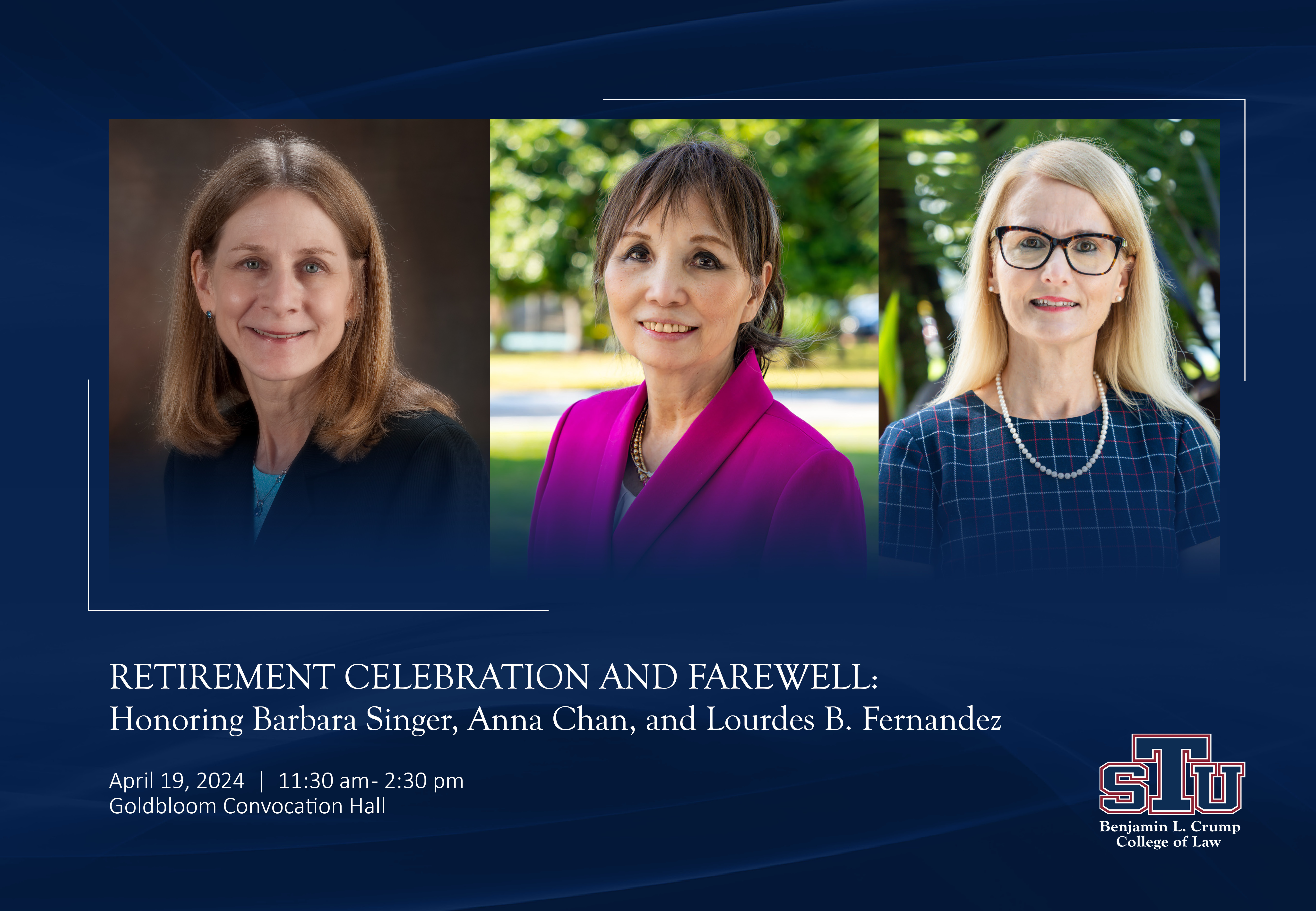 It is the special pleasure of our STU College of Law to invite you to attend and celebrate with us the retirement of Professors Barbara Singer and Annie Chan, after decades of service and teaching at our institution. We will also be honoring and wishing farewell to Assistant Dean Lourdes Fernandez, who will no longer be with us after this spring, following years of constant service and support to our College of Law.